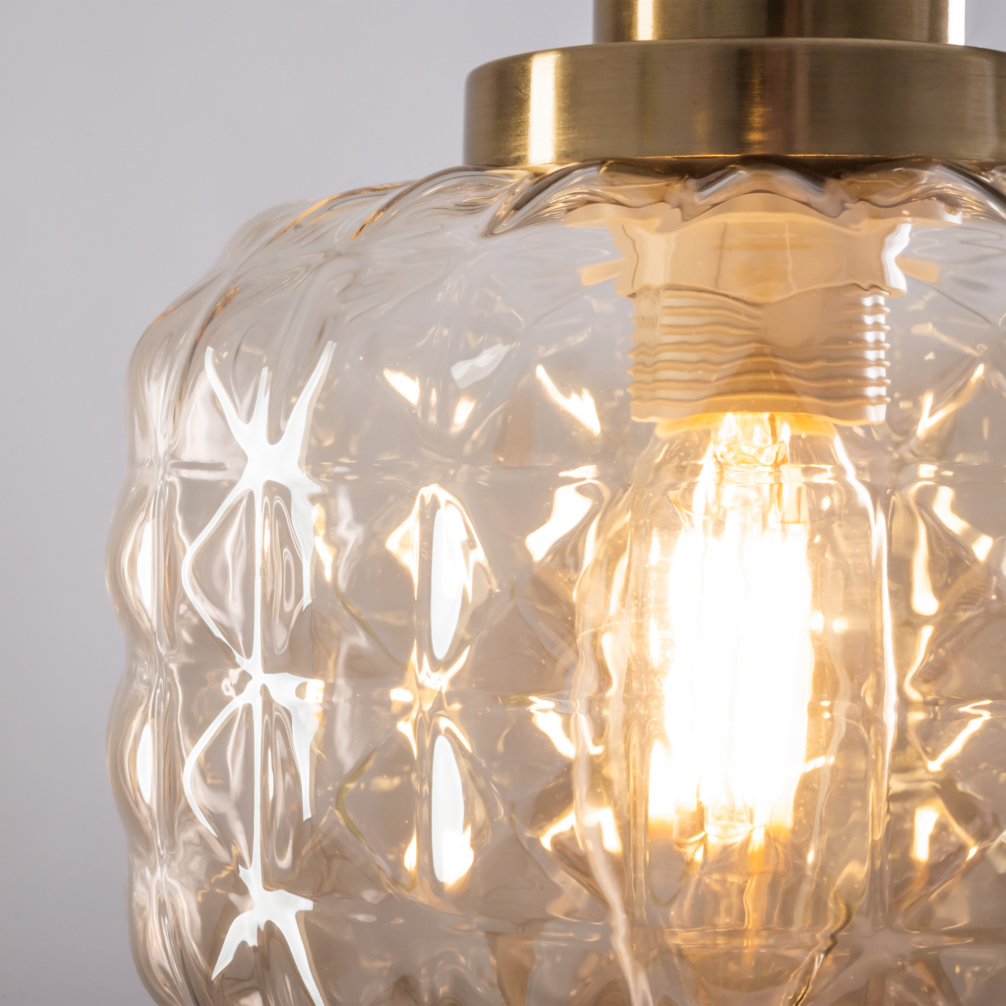 Металлическая арматура в цвете латунь. Плафоны из толстого рельефного стекла в оттенке амбра с «шипованной» огранкой. Подвесные модели регулируется по высоте. Источник света — лампа с цоколем Е14