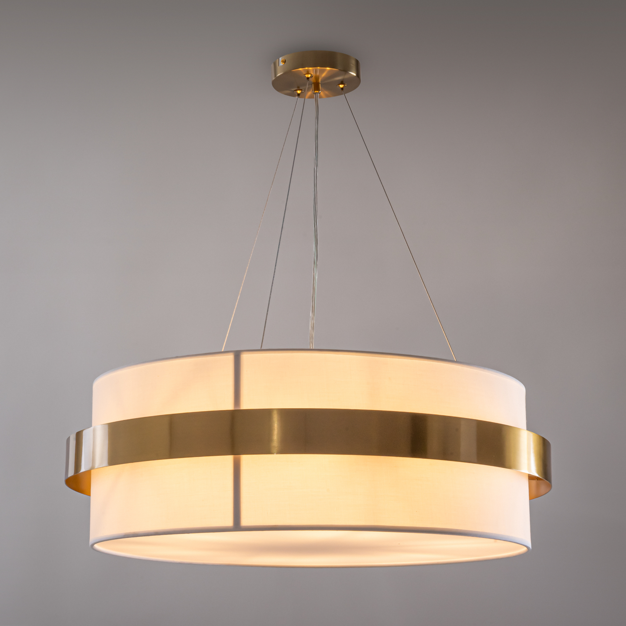 Цилиндрической формы абажур из ткани белого цвета. Декоративная парящая окантовка из металла в цвет арматуры. Регулируется по длине. Компактные размеры подходят для низких потолков и небольших интерьеров. Металлическая арматура, цвет — латунь и никель. Источник света — лампа с цоколем Е14, E27 и для настенного бра дополнительный LED с температурой свечения 3000 K.