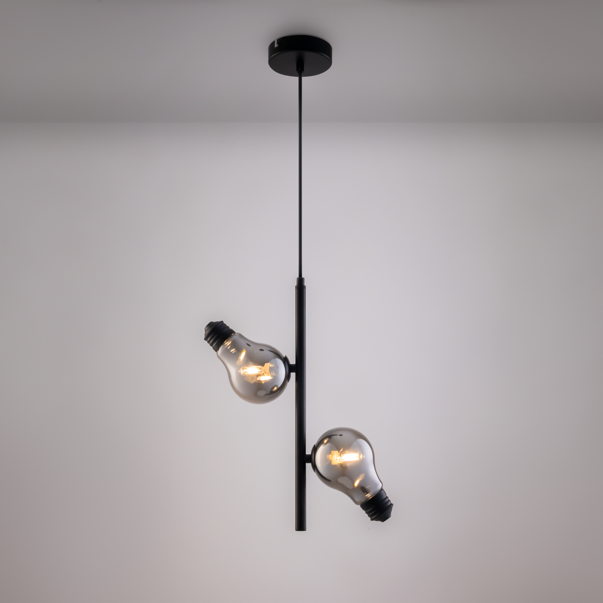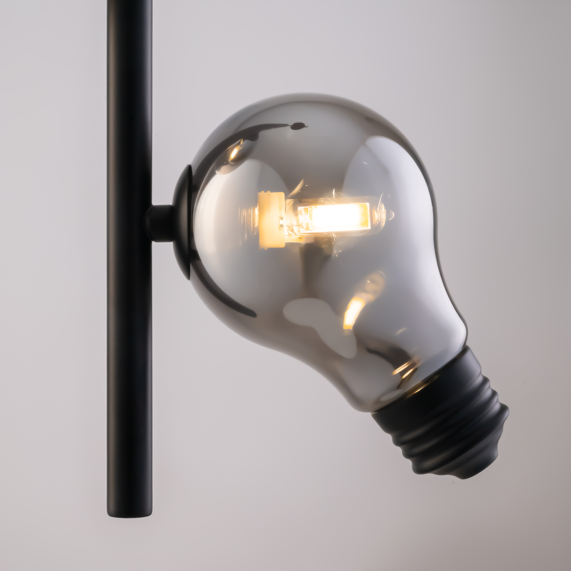 Металлическая арматура, цвета — чёрный и латунь. Прозрачные плафоны-лампочки из стекла в тон арматуры хаотично “разбросаны” по острову светильника. Подвесы регулируются по высоте. Источник света — лампа с цоколем G9.