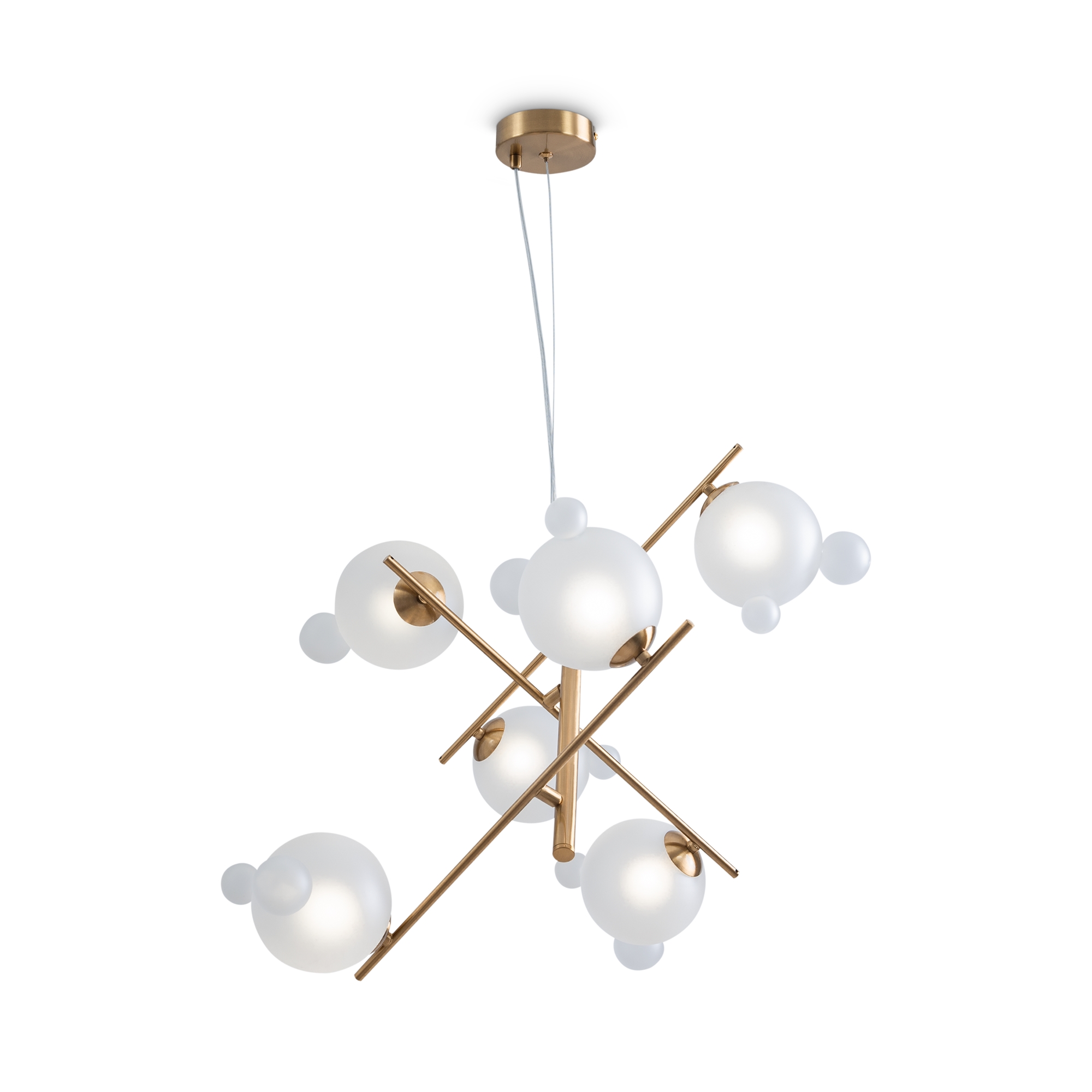 Арматура — металл, цвет— латунь. Белые плафоны из стекла с декоративными “ушками” — напоминают образ знаменитого диснеевского героя. Ассиметричный силуэт создает эффект подвижной игры. Высота подвесных моделей регулируется. Источник света — лампа с цоколем G9
