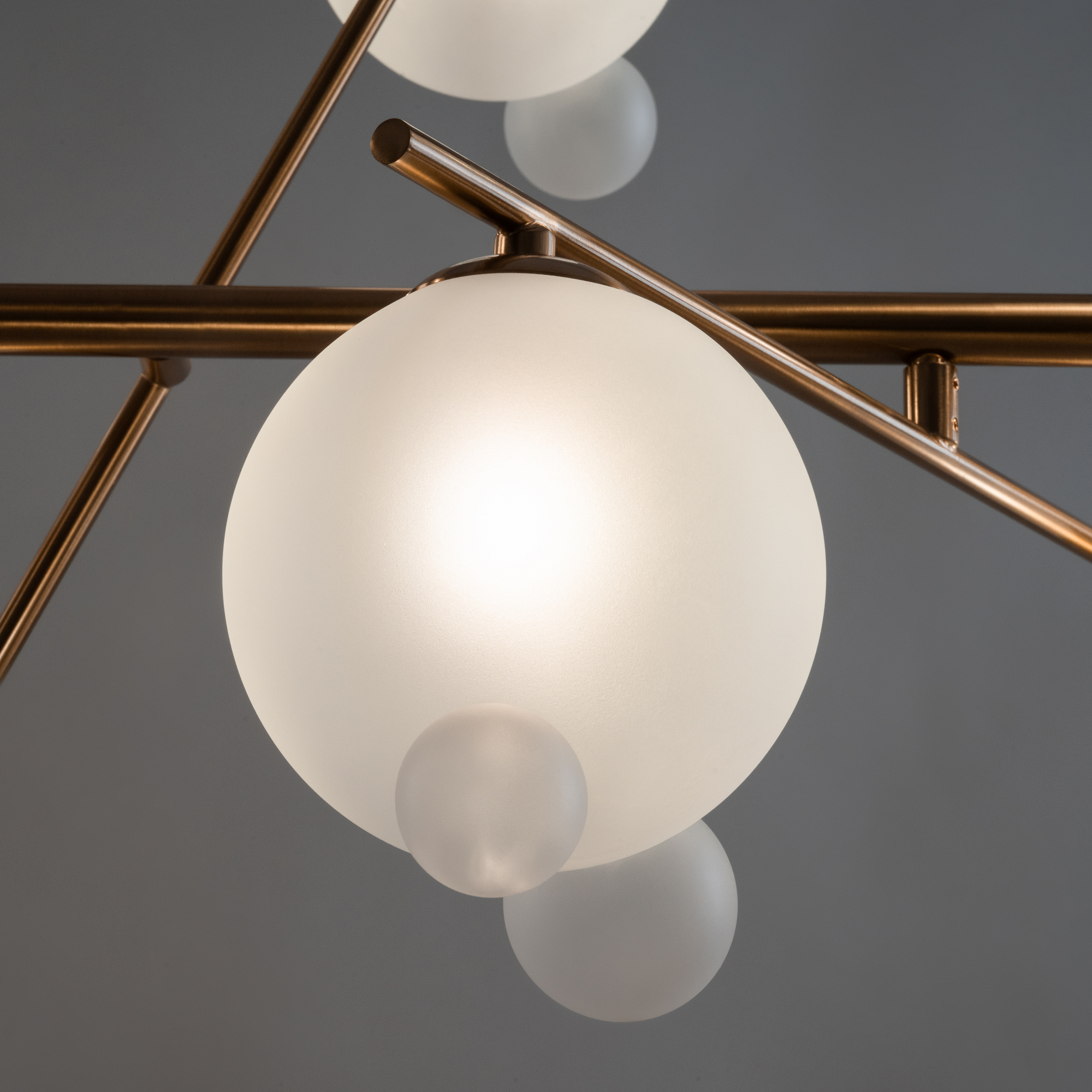 Арматура — металл, цвет— латунь. Белые плафоны из стекла с декоративными “ушками” — напоминают образ знаменитого диснеевского героя. Ассиметричный силуэт создает эффект подвижной игры. Высота подвесных моделей регулируется. Источник света — лампа с цоколем G9