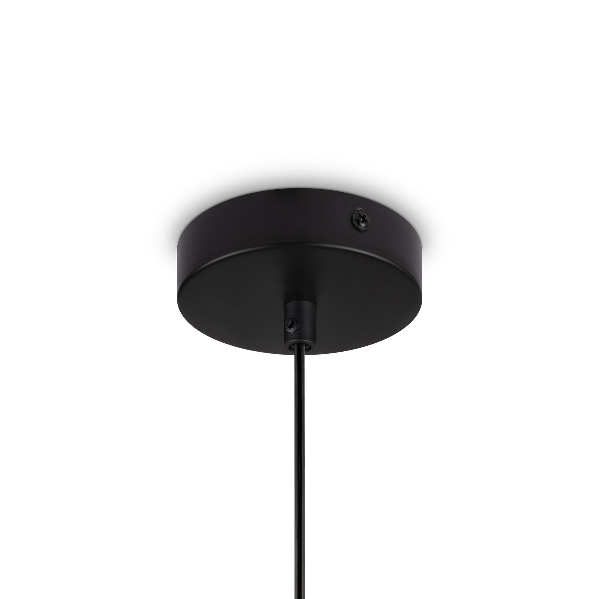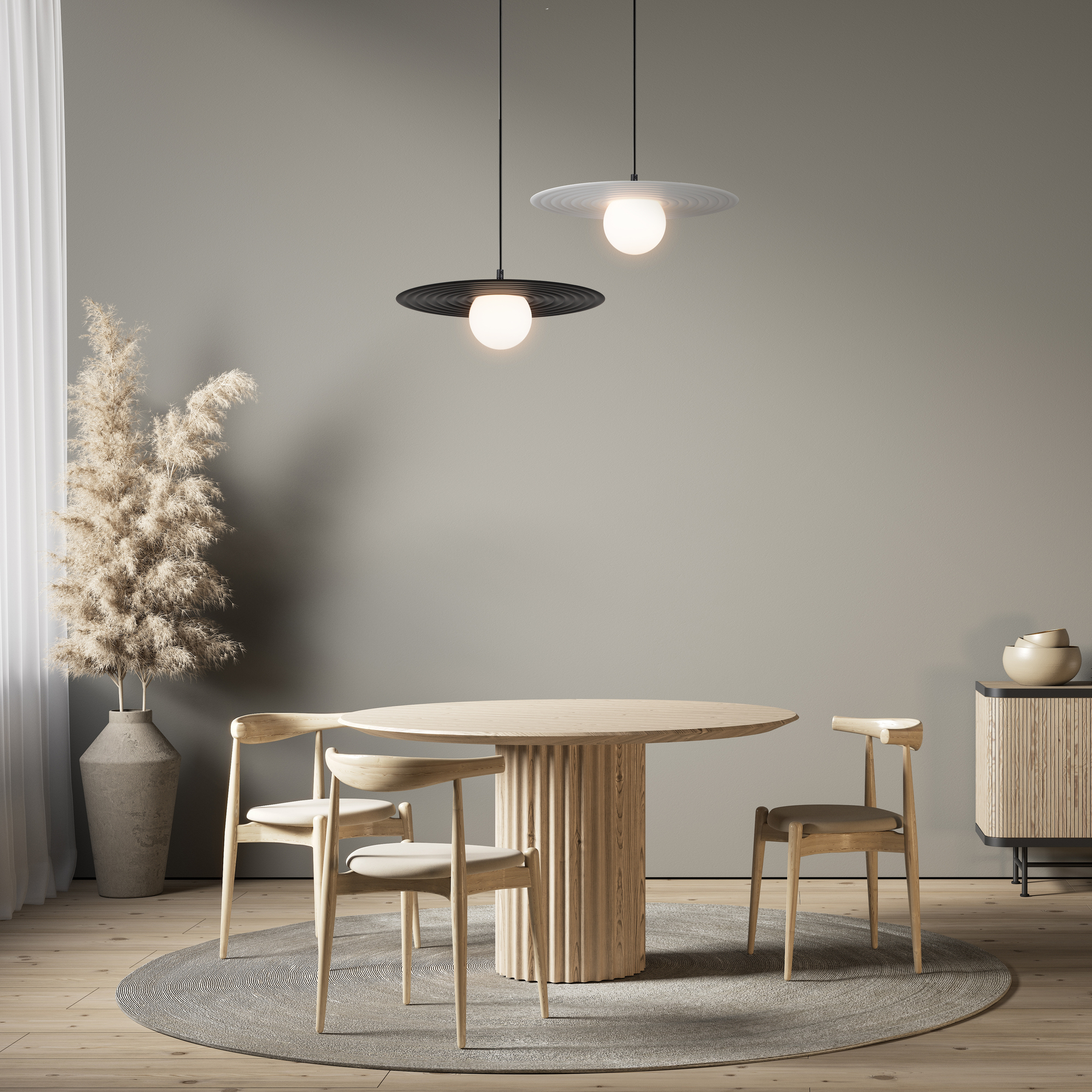 Арматура — металл, цвета — чёрный и белый. Матовый белый плафон с декоративным элементом — металлической тарелкой. Можно регулировать минимальную и максимальную высоту. Лампа с цоколем G9 служит источником света.