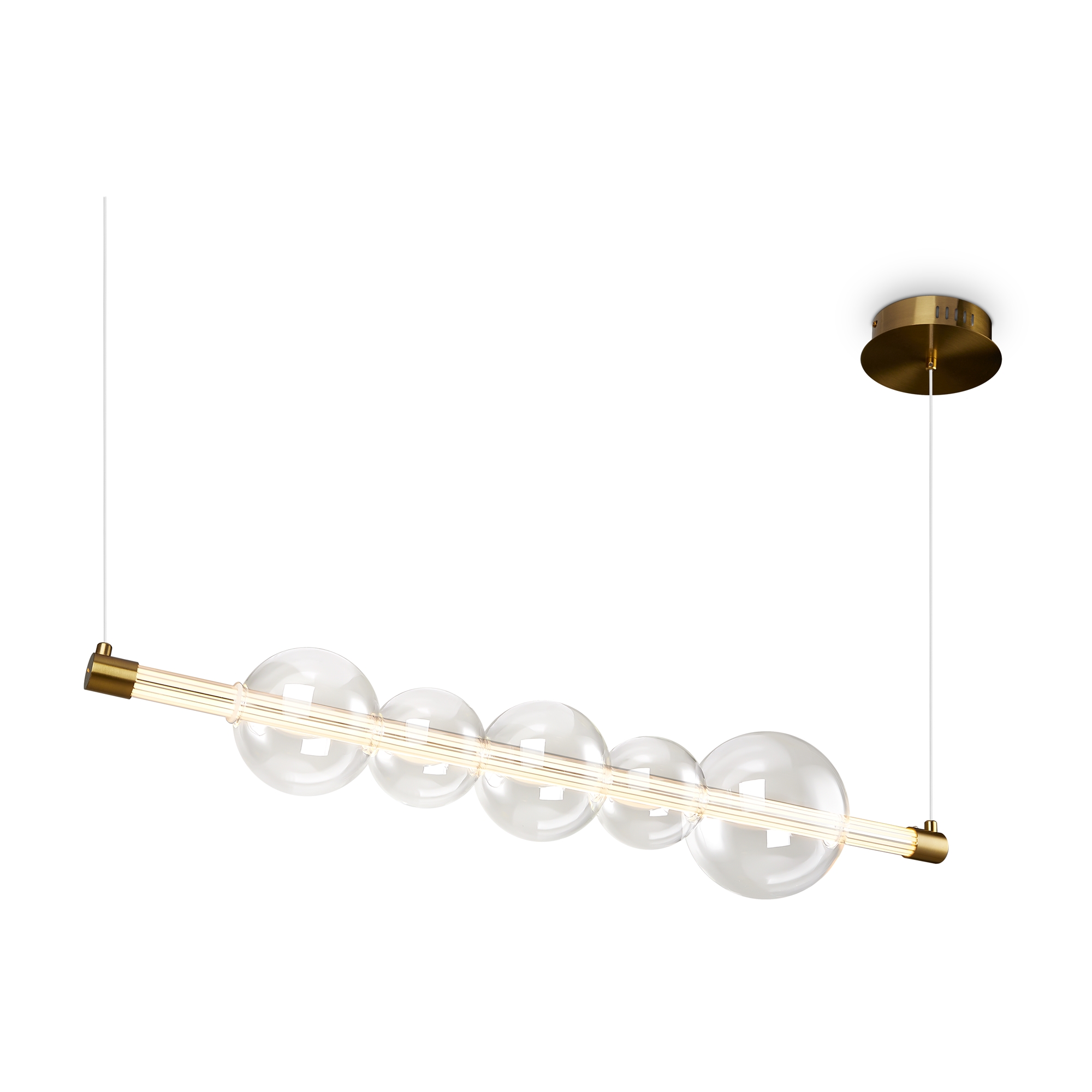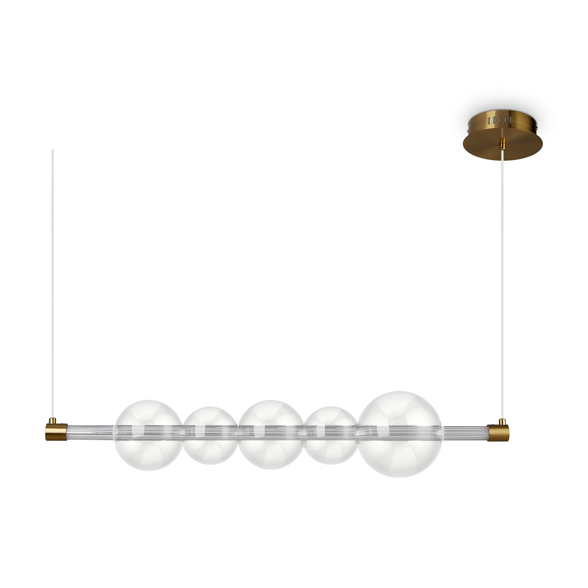 Арматура — металл, цвет — латунь. Тренд «invisible light» — LED-источник света скрыт в горизонтальной стеклянной трубке, пронизывая ряд декоративных плафонов-шаров разного размера из прозрачного стекла. Воздушная минималистичная горизонтальная конструкция. Регулируемая высота. Цветовая температура — 3000К.