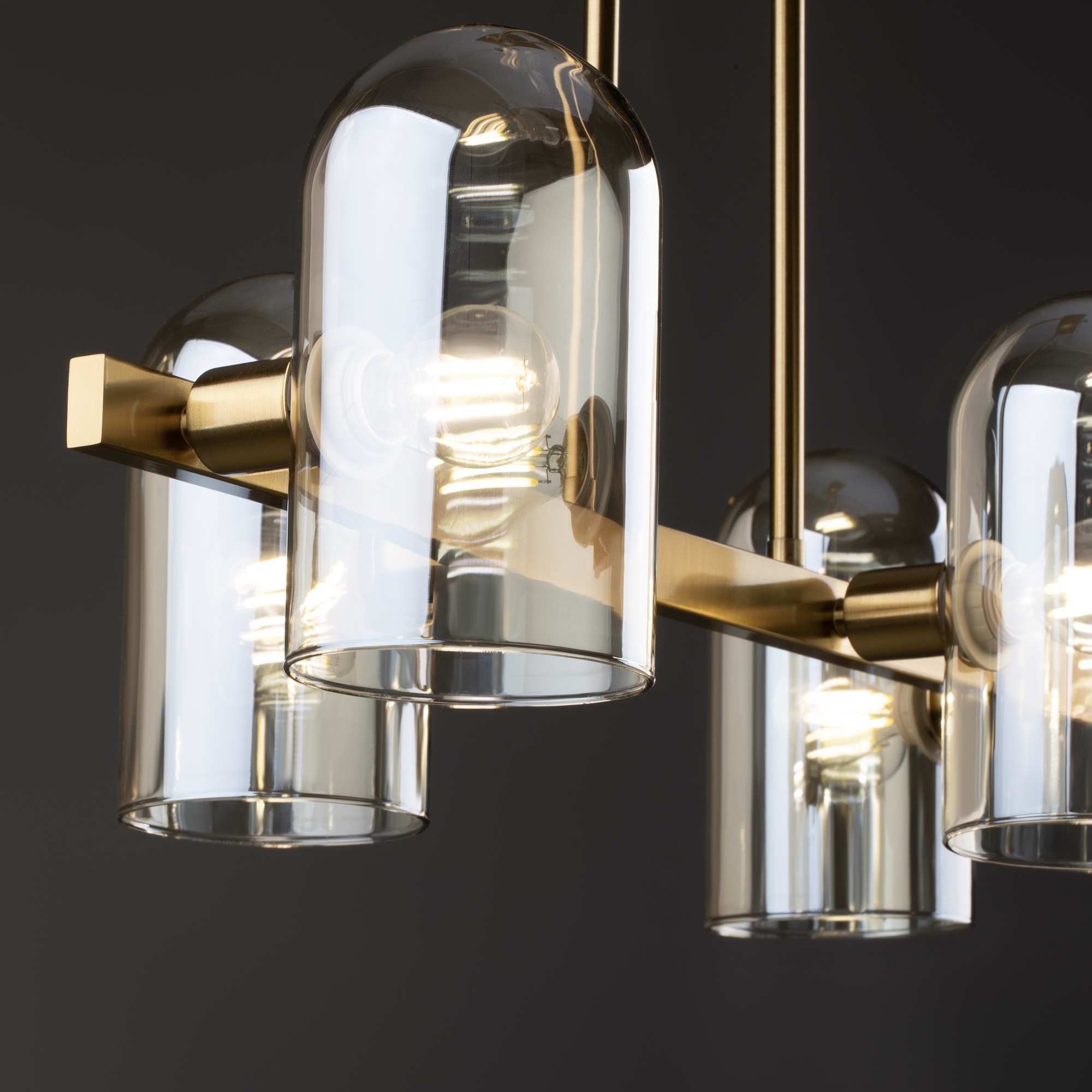 Арматура — металл. Цвет — латунь. Горизонтальные подвесы на твердой ножке. Плафоны из коньячного стекла в форме конуса. Направление плафона у настенного светильника можно регулировать за металлическое основание. Источник света лампа. Цоколь E14.