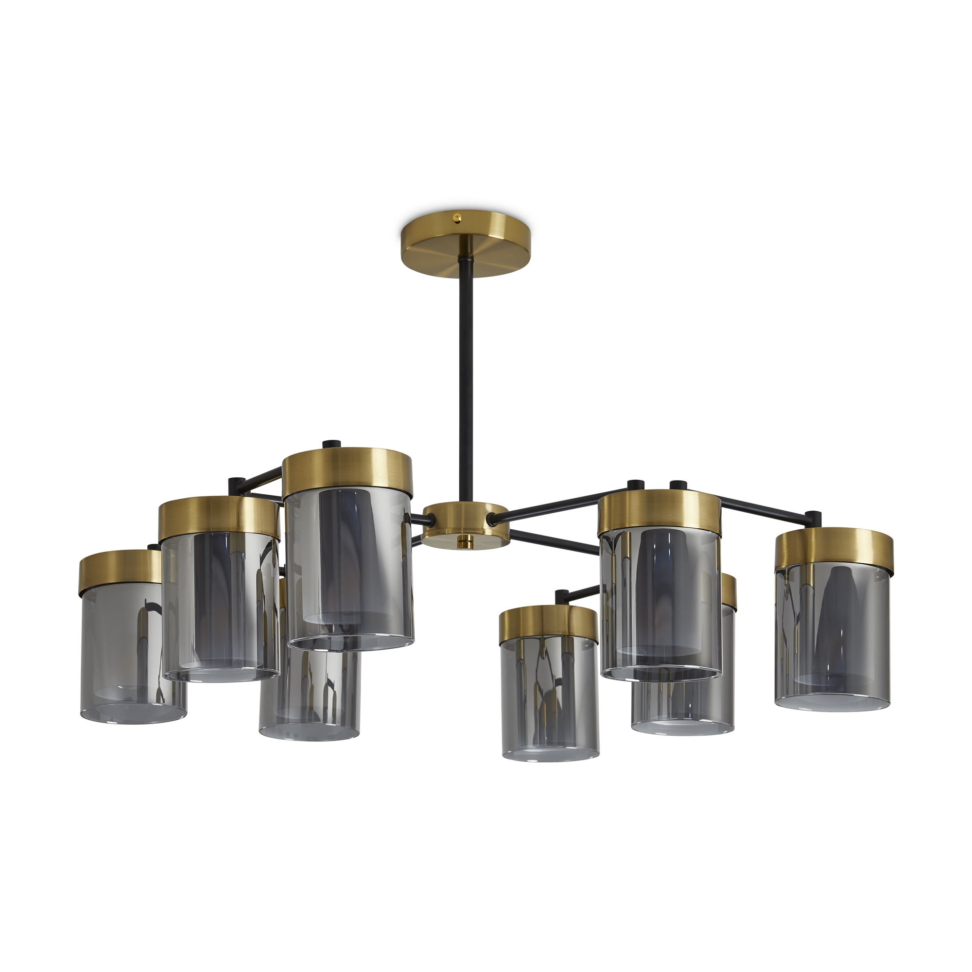 Арматура — металл в двух востребованных оттенках латунь и черный. Плафоны из двойного стекла дымчатого оттенка, внутри белый матовый. Трендовая форма плафонов в виде цилиндра. Потолочные светильники подойдут для помещений с низкими потолками. Источник света лампа. Цоколь E14