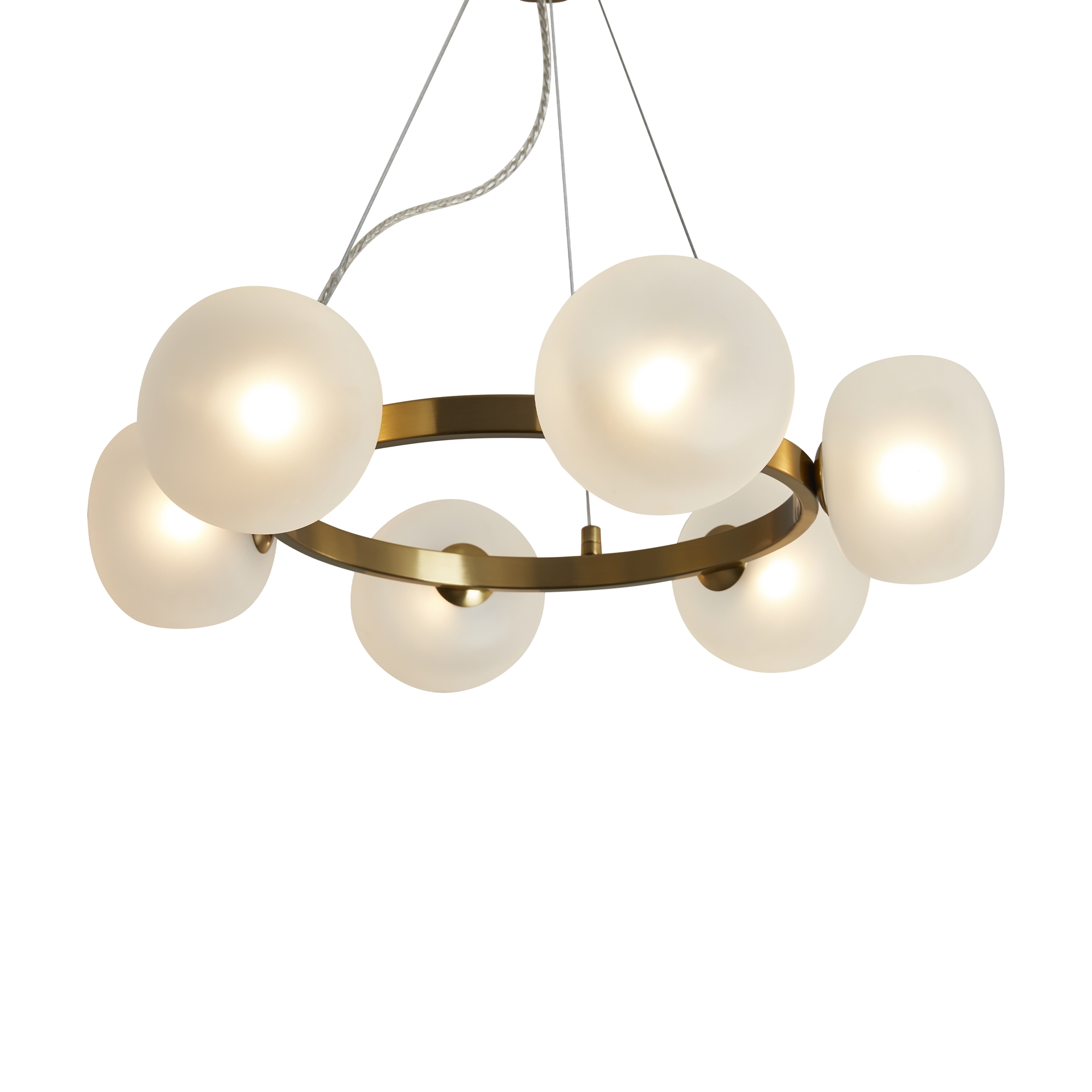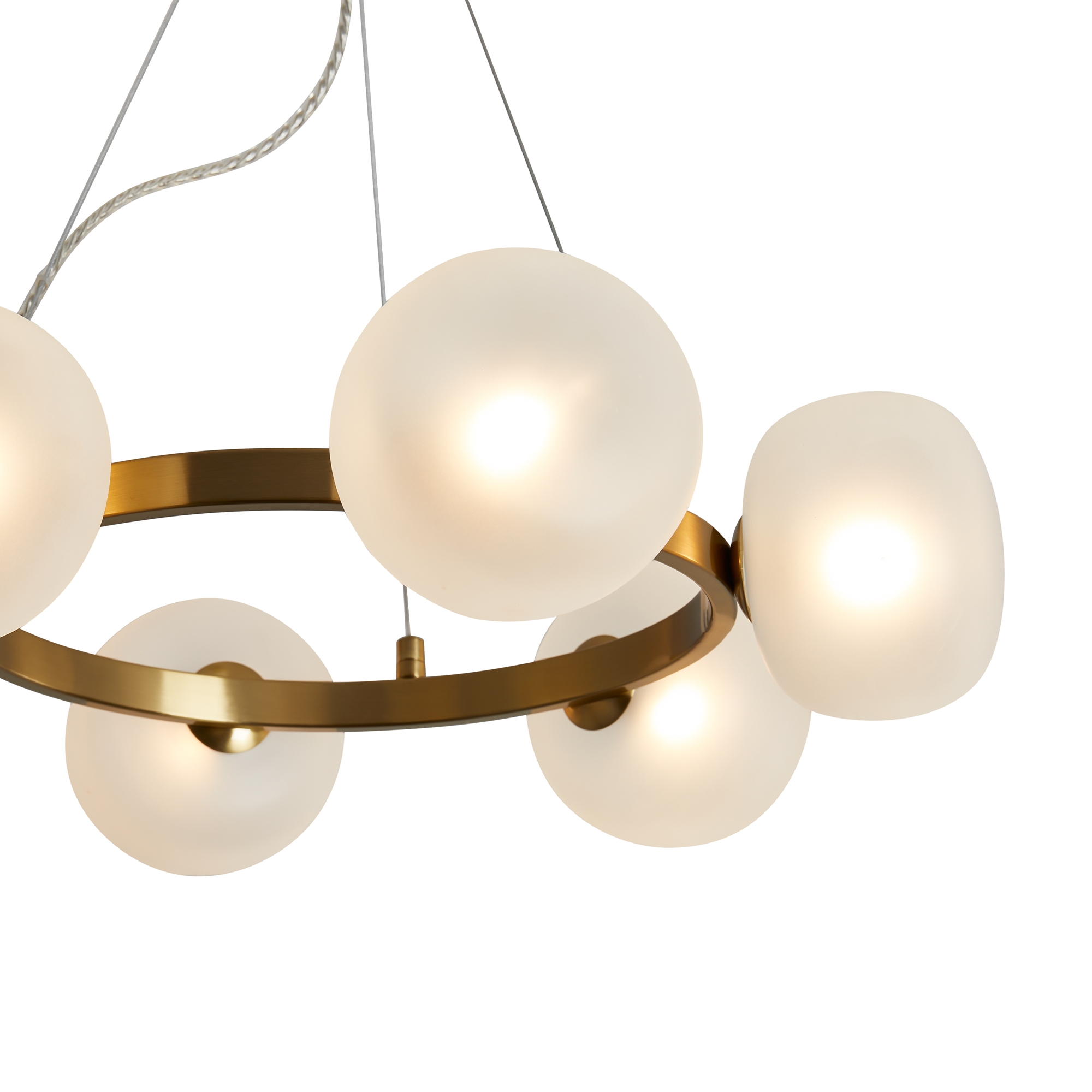 Арматура — металл. Цвет арматуры — латунь. Серия с необычной формой плафонов — немного приплюснутые, матовые белые. Настольные лампы и настенные бра выгнутой формы. Источник света лампа. Цоколь G9.