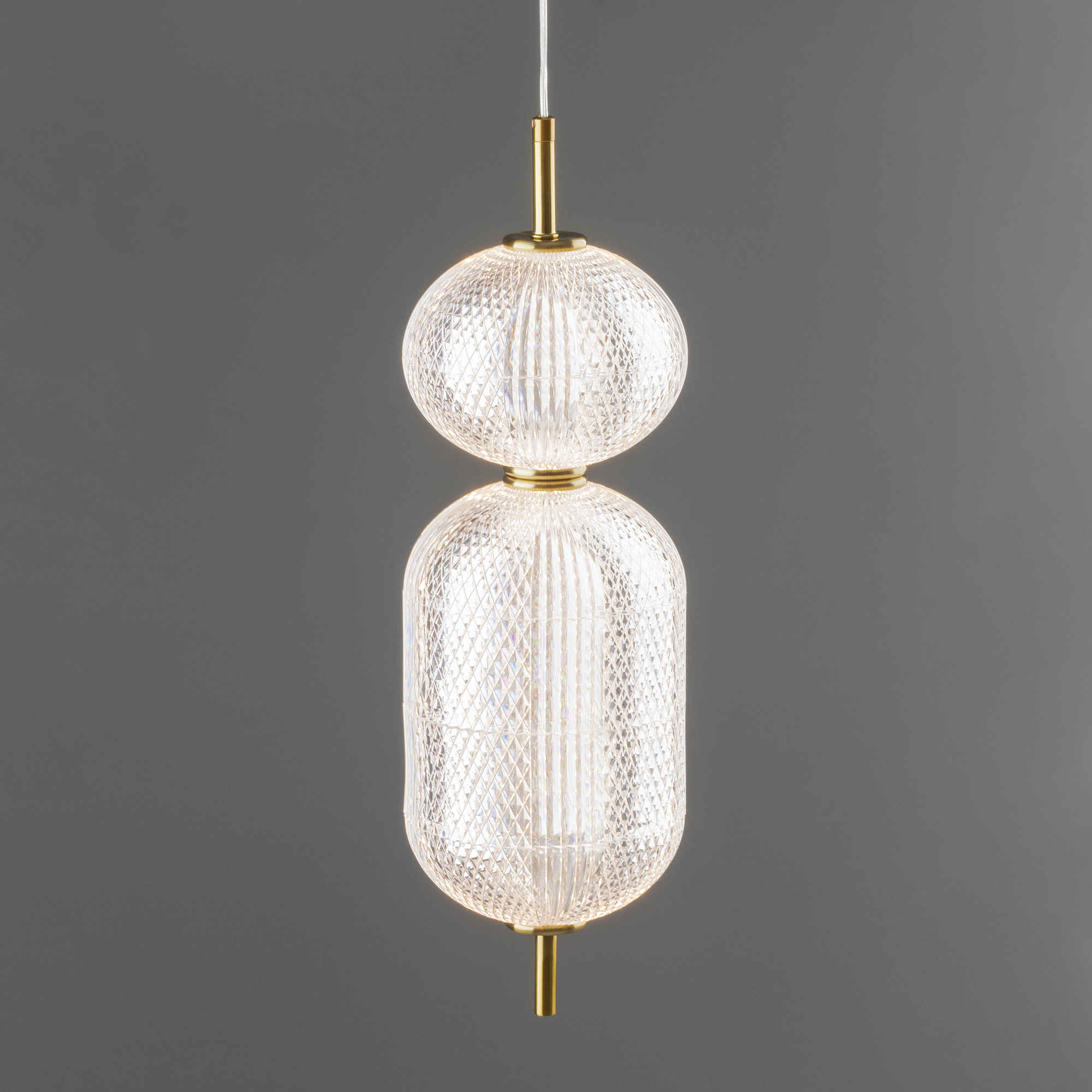 Арматура выполнена из металла в цвете латунь. Прозрачные плафоны. Вертикальные и горизонтальные подвесные светильники разных размеров. LED источник света. Цветовая температура 3000К.