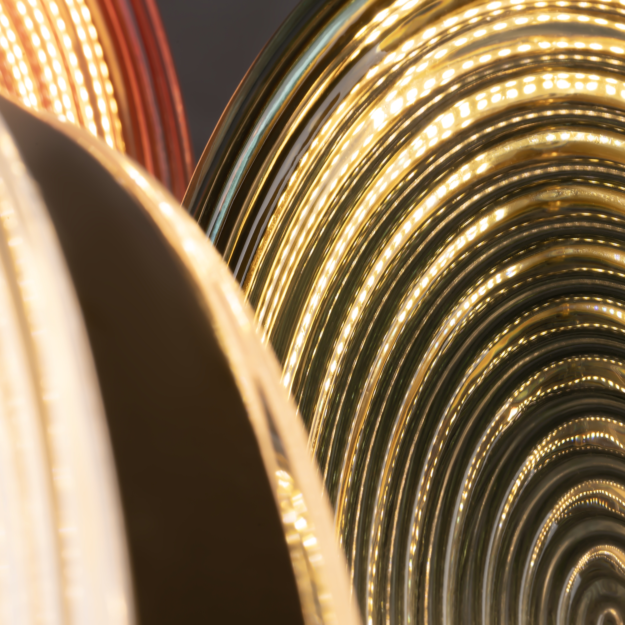 Арматура металл. Цвет латунь. Плафон из подкрашенного стекла. Одинарные подвесы 3 х цветов и в том числе популярный каскад сочетающий в себе три цвета подвесов. LED источник света. Цветовая температура 3000К.