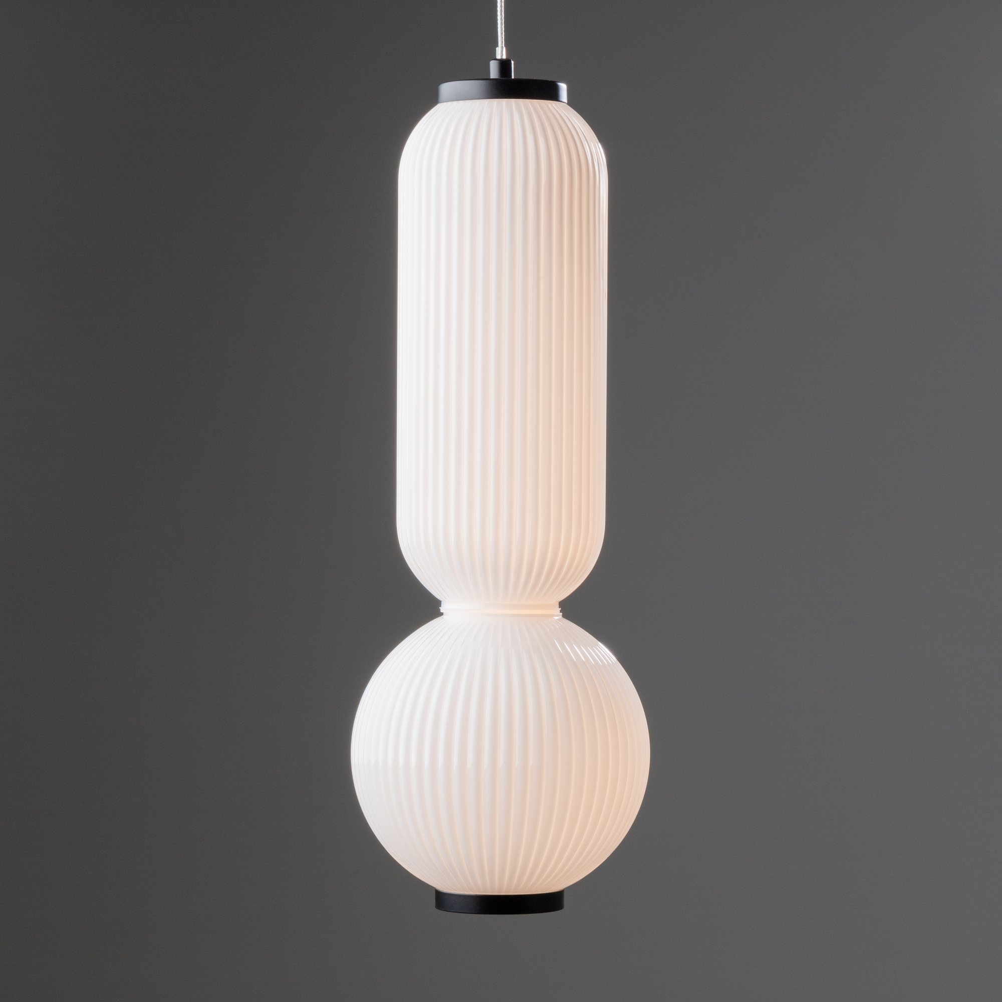 Арматура металл. Цвет черный. Плафоны вытянутой формы из подкрашенного стекла. Цвет матовый белый и зелено-белый. Одинарные подвесы. LED источник света. Цветовая температура 3000К.
