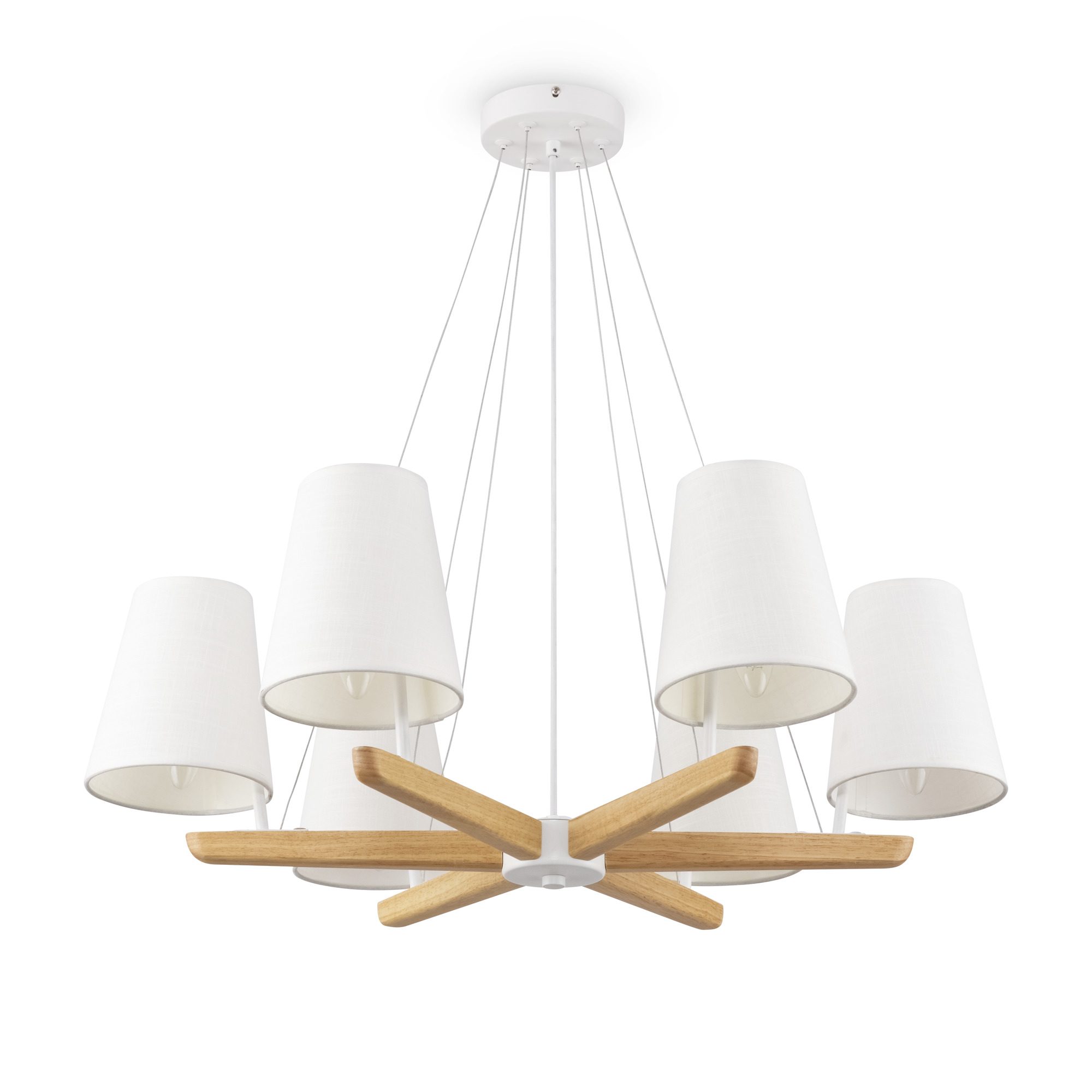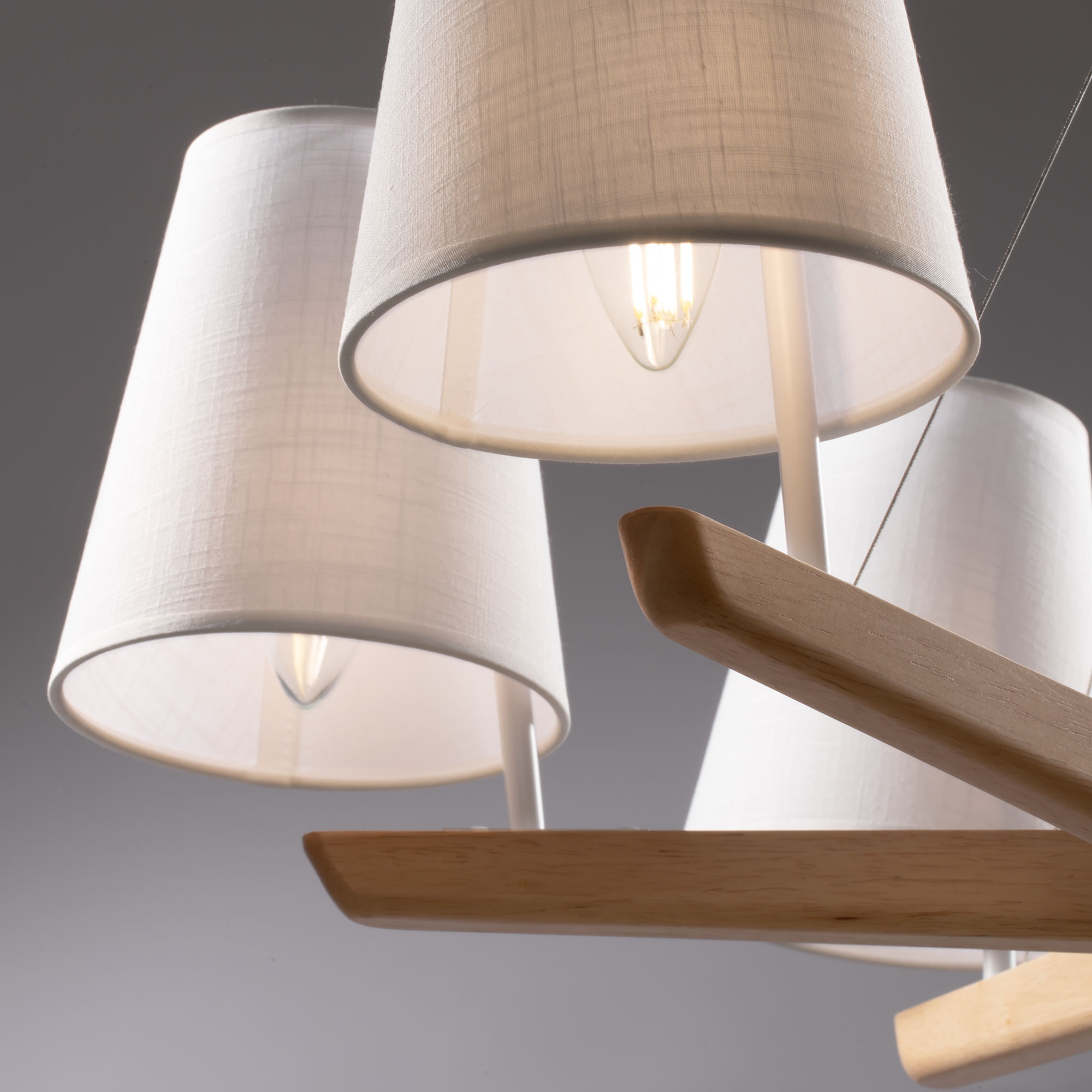 Материал арматуры – металл, цвет – белый. Абажуры из текстиля белого оттенка. Декоративные элементы из натурального дерева. Трендовый экодизайн. Источник света – лампа с цоколем E14.