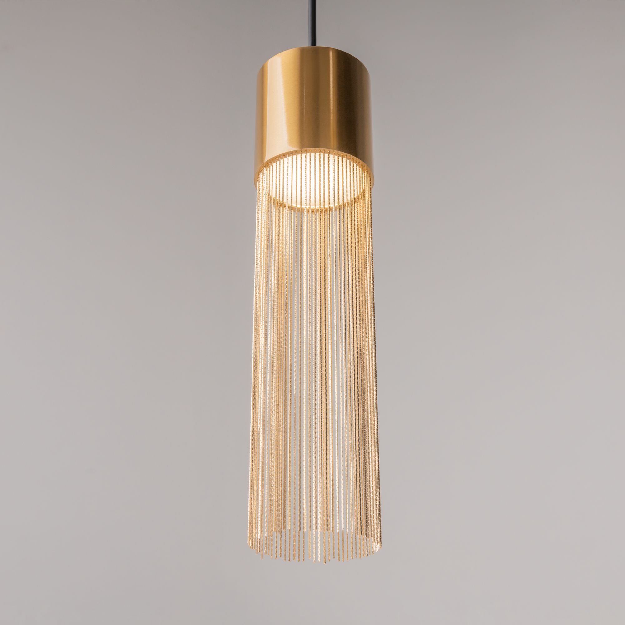 Металлическая арматура, цвет — золото. Мотивы ювелирного искусства в дизайне. Изящные цепочки на корпусе светильника создают переливы бликов. LED источник света. Цветовая температура — 3000К. Регулируемая высота подвесного светильника.