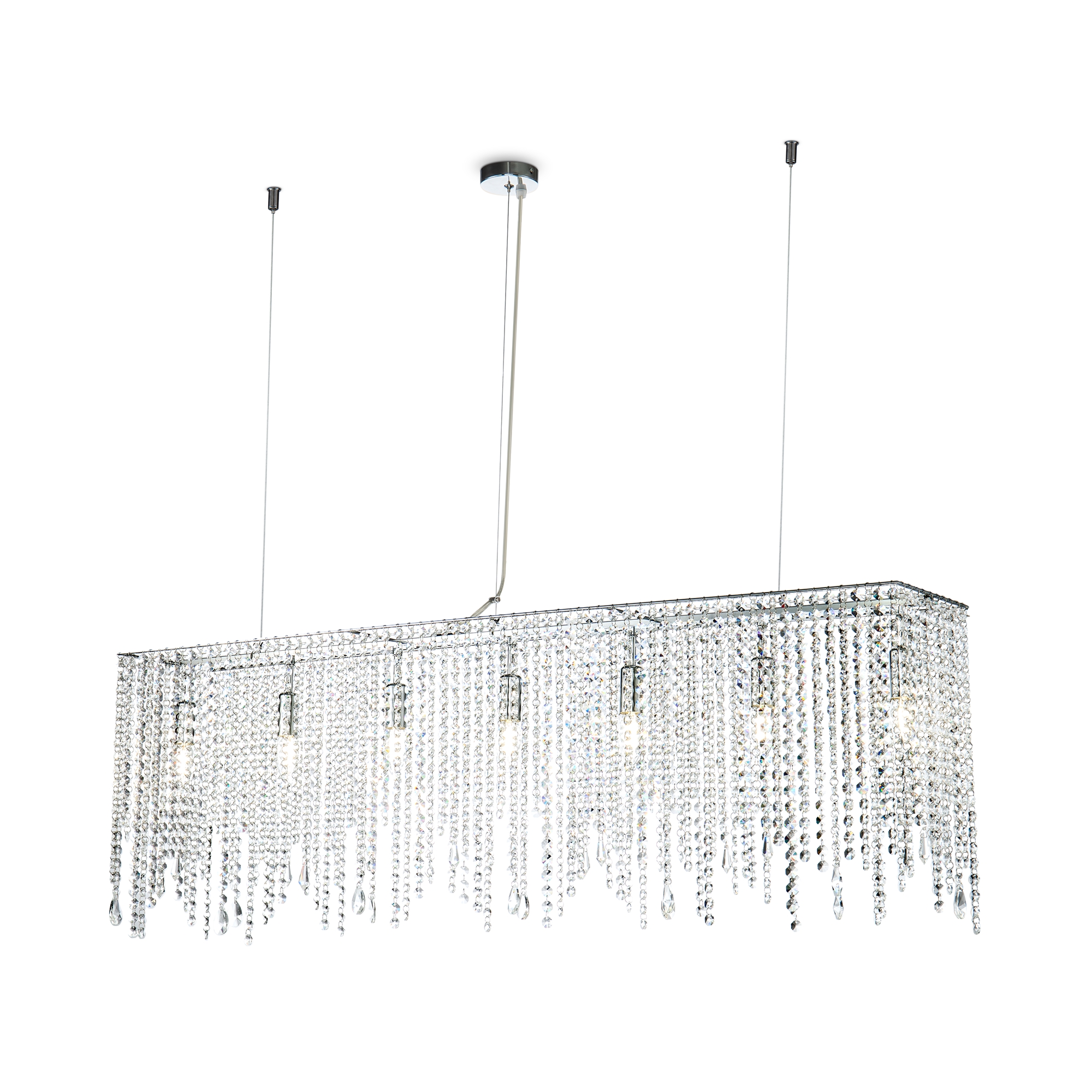 Арматура из металла в цвете хром. Декор – подвески из прозрачного хрусталя. Оригинальная прямоугольная форма. Высота светильников регулируется тросом.
