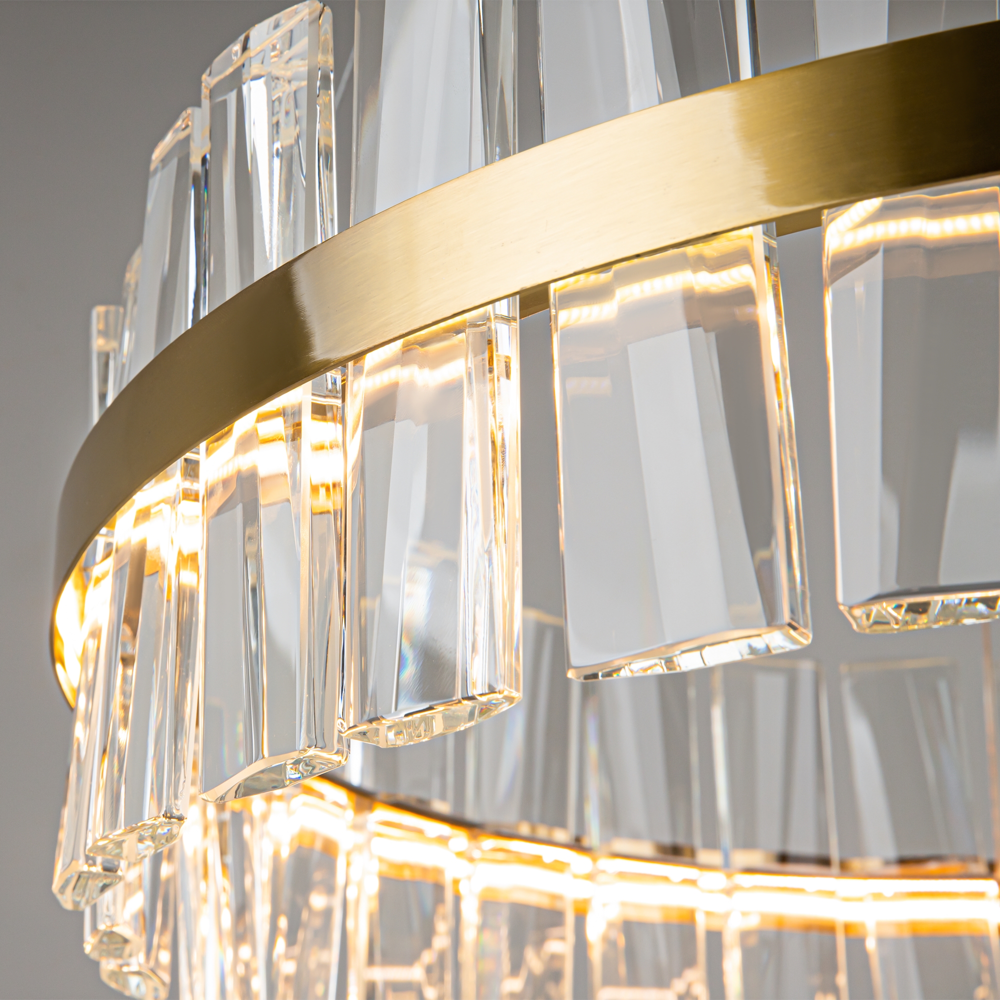 МатМатериал арматуры — металл, цвет — латунь. Декор — объемные прозрачные хрустальные элементы с чередующимся рисунком. LED источник света, цветовая температура — 3000К. Регулируемая длина тросов.