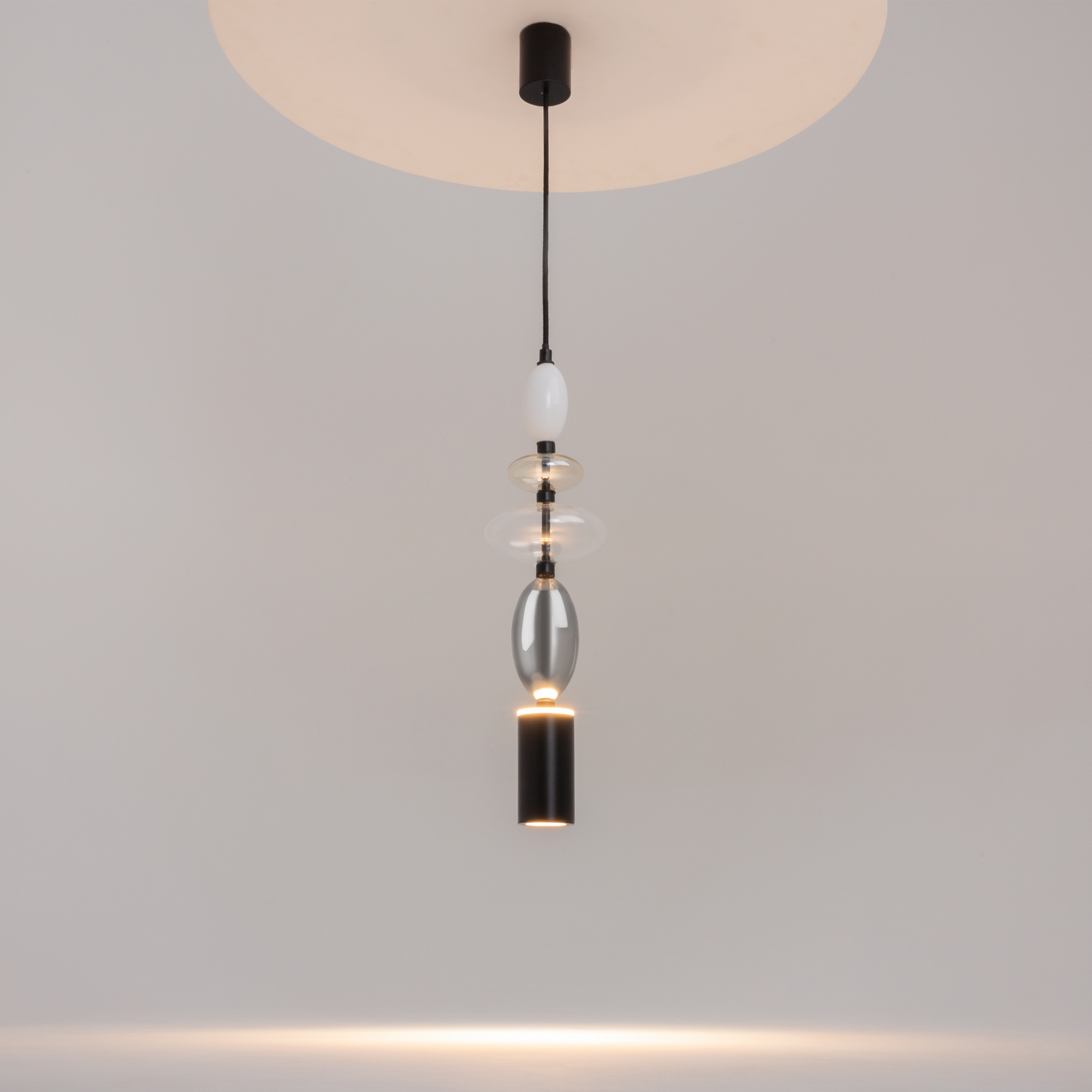 Черная металлическая арматура. Плафоны из стекла коньячного, белого, дымчатого цвета и прозрачный. Источник света комбинированный: нижний — съемная лампа с цоколем GU10, верхний — встроенный LED. Цветовая температура светильников 2700К, угол рассеивания света 120 градусов. Высота регулируется с помощью провода длиной 3 м. Монохромный дизайн, стеклянные элементы впишутся в различные стили интерьеров.