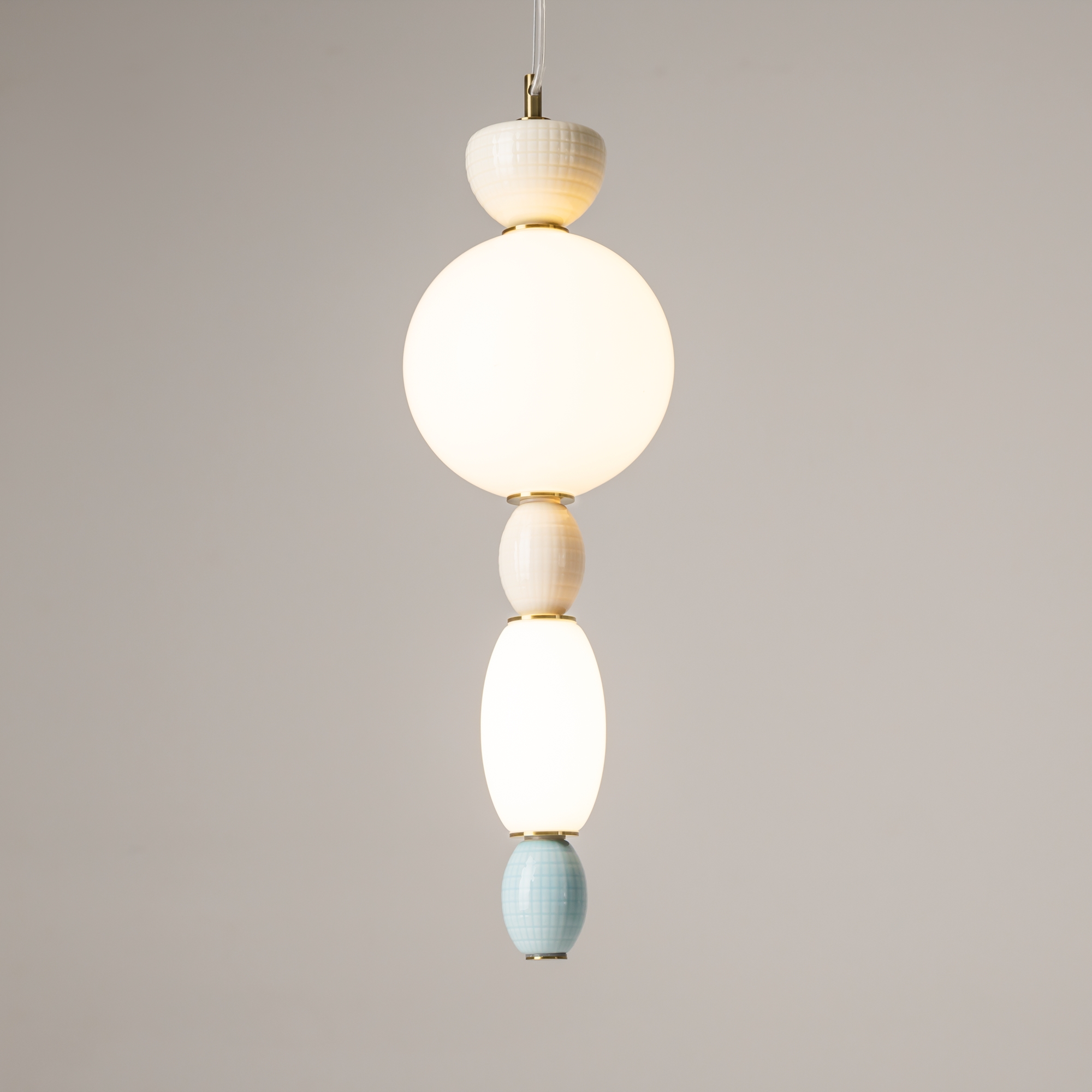Металлическая арматура цвета латуни. Плафоны из белого стекла для мягкого, равномерного освещения, декоративные элементы из цветной керамики. Угол рассеивания 120°. Цветовая температура – 3000 К. Регулируемый провод длиной 3 м.