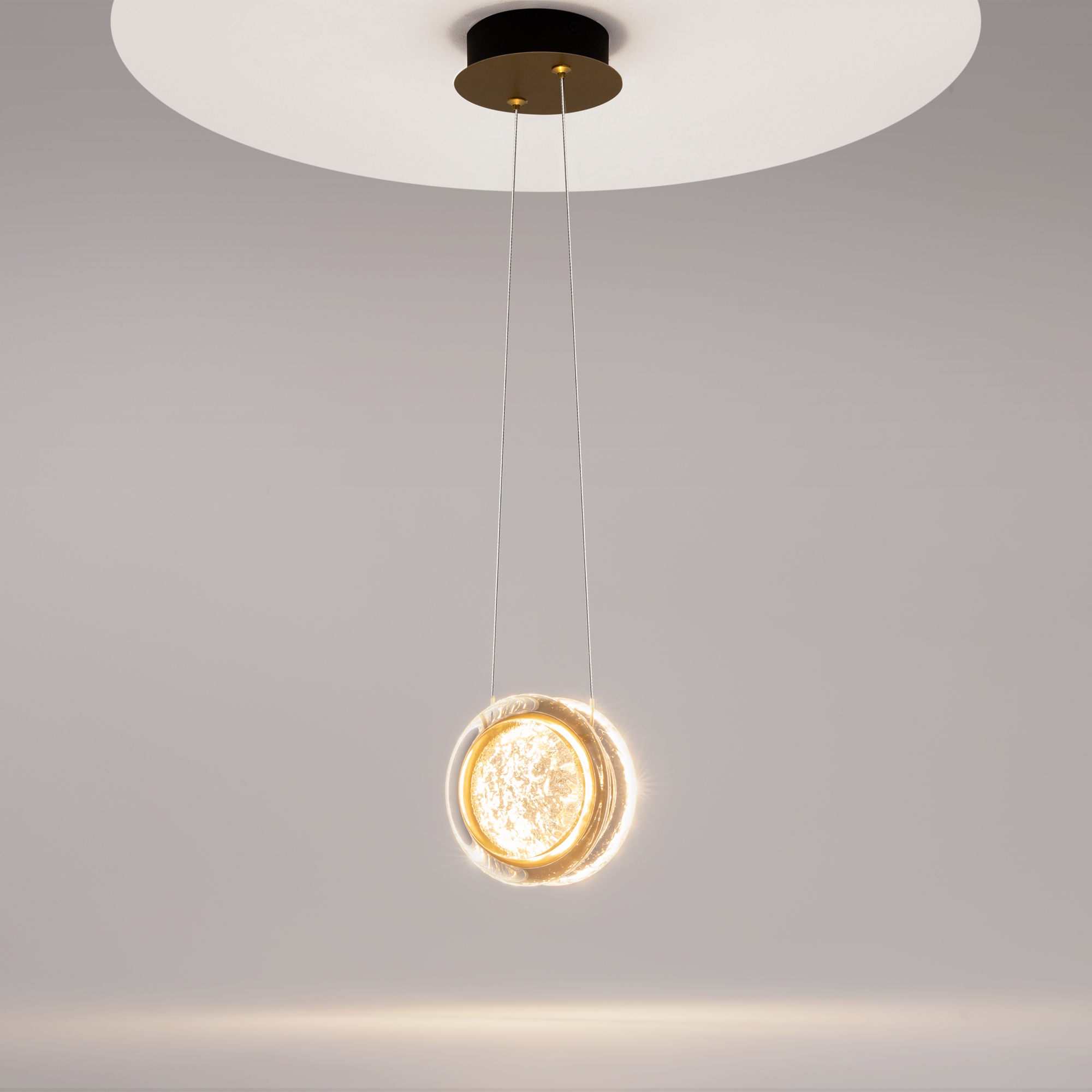 Арматура из металла цвета латунь с сатинированным финишным покрытием сочетается с прозрачными плафонами. Подвесные одинарные, горизонтальный и каскадные светильники оснащаются LED-модулем с двумя плоскими плафонами из акрила со сложным, актуальным паттерном на поверхности. Цветовая температура — 3000К, угол рассеивания — 125 градусов.