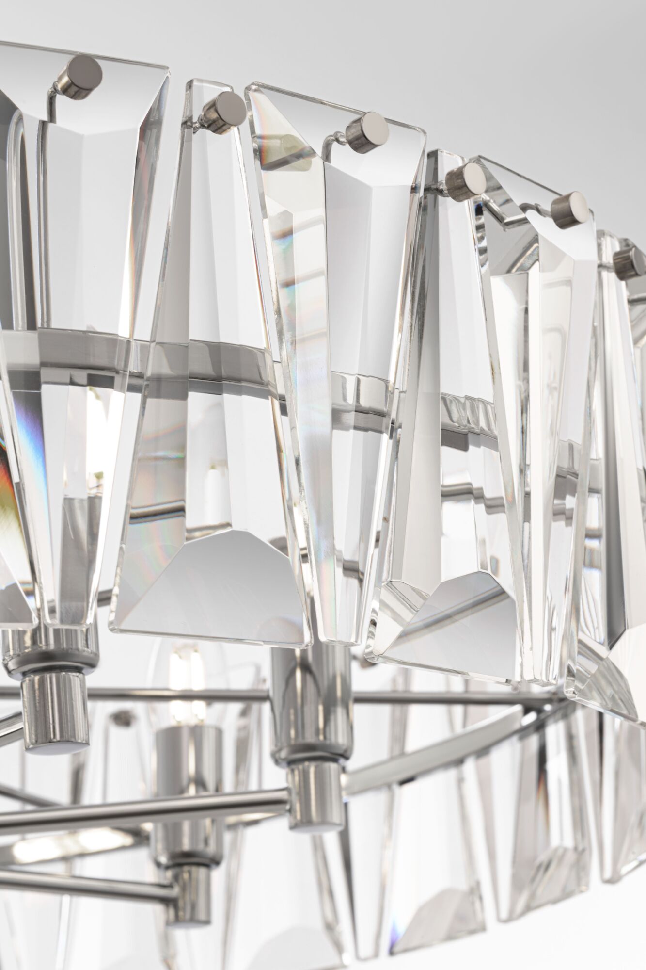 Материал арматуры – металл, оттенки – хром и золото. Декор – массивные крис таллы сложной огранки. Высота подвесных моделей регулируется длиной цепи. Источник света — лампа с цоколем Е14.