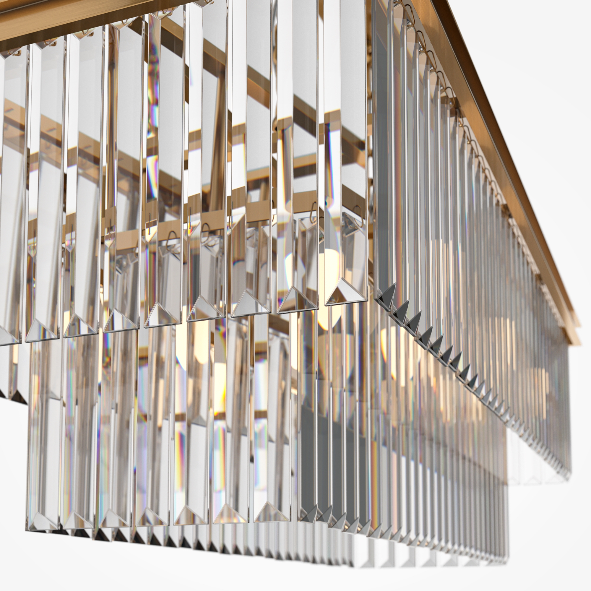 Арматура из металла в трех оттенках: латунь, хром, золото. Многоярусный декор. Подвески: прозрачное (арматура – хром, латунь) и янтарное (арматура – золото) стекло. Высота подвесных моделей регулируется.