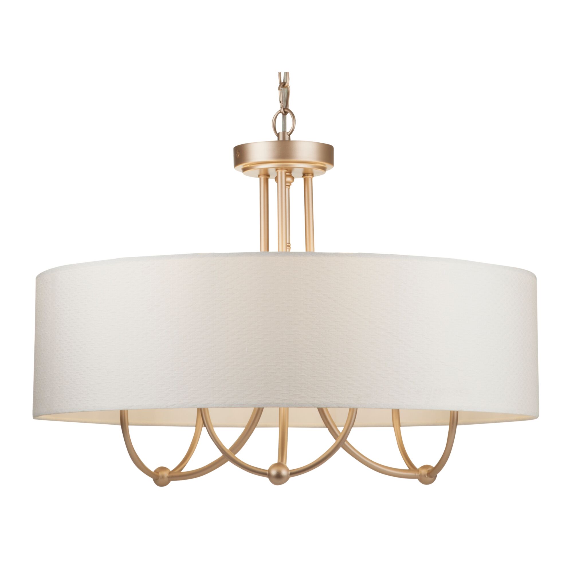 Металлическая арматура в цвете матового золота. Абажур с тиснением – ткань на ПВХ, цвет – кремовый. Декоративные элементы с флористическим узором. Регулируемая высота. Источник света — лампа с цоколем Е14.
