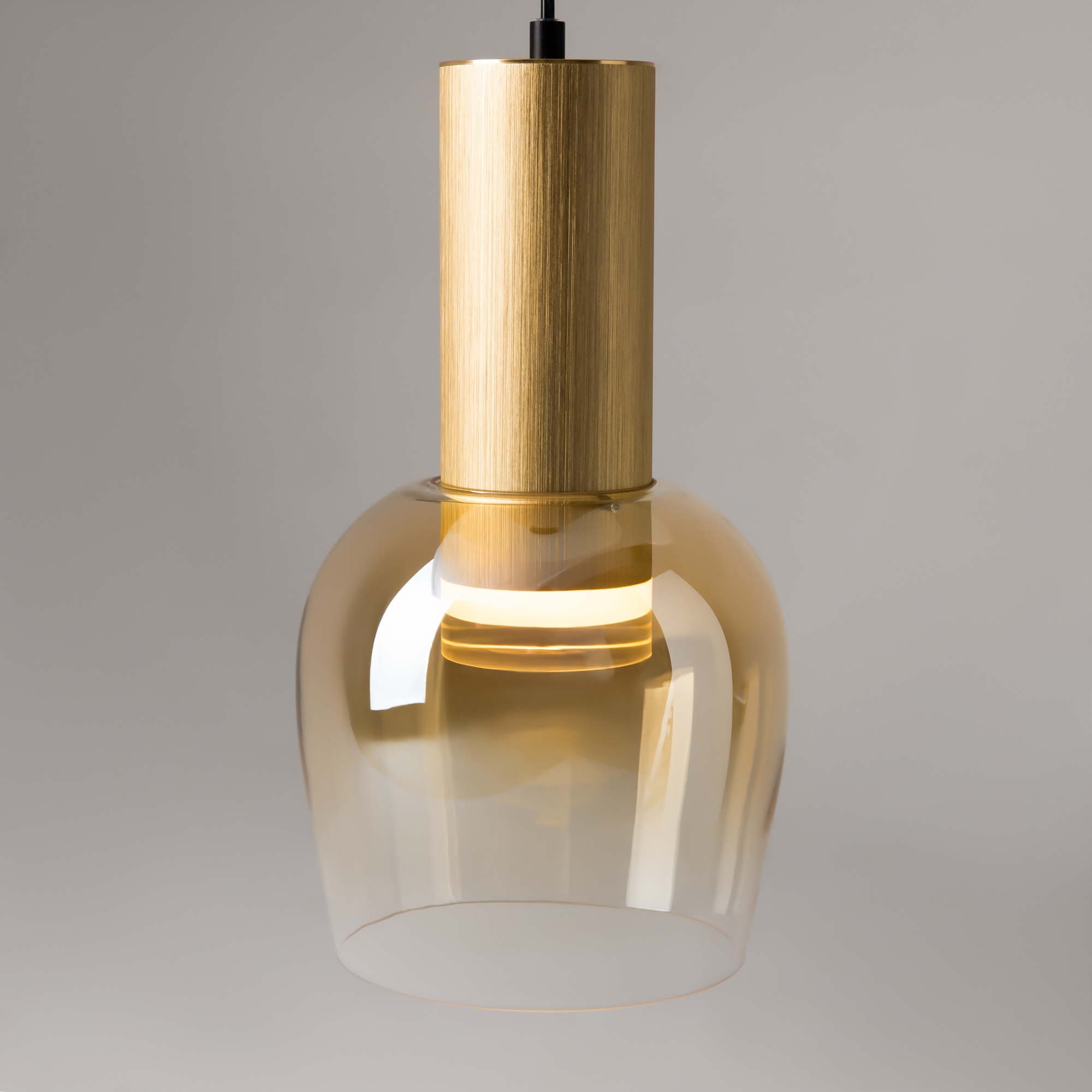 Цветовая гамма: дымчато-серый или насыщенно-янтарный цвет стекла в сочетании с черной или золотой арматурой. В серии есть модели светильников со сменным источником света с цоколем Е27 (каскадная композиция, потолочный и настольные светильники) и LED-источником (одинарные подвесные светильники). Температура свечения LED – 3000 К, угол рассеивания — 120 градусов. Плафоны каскадной композиции плафоны разных размеров и оттенков, установленные на одно основание. Оригинальный декор — актуальный вариант современной классики.