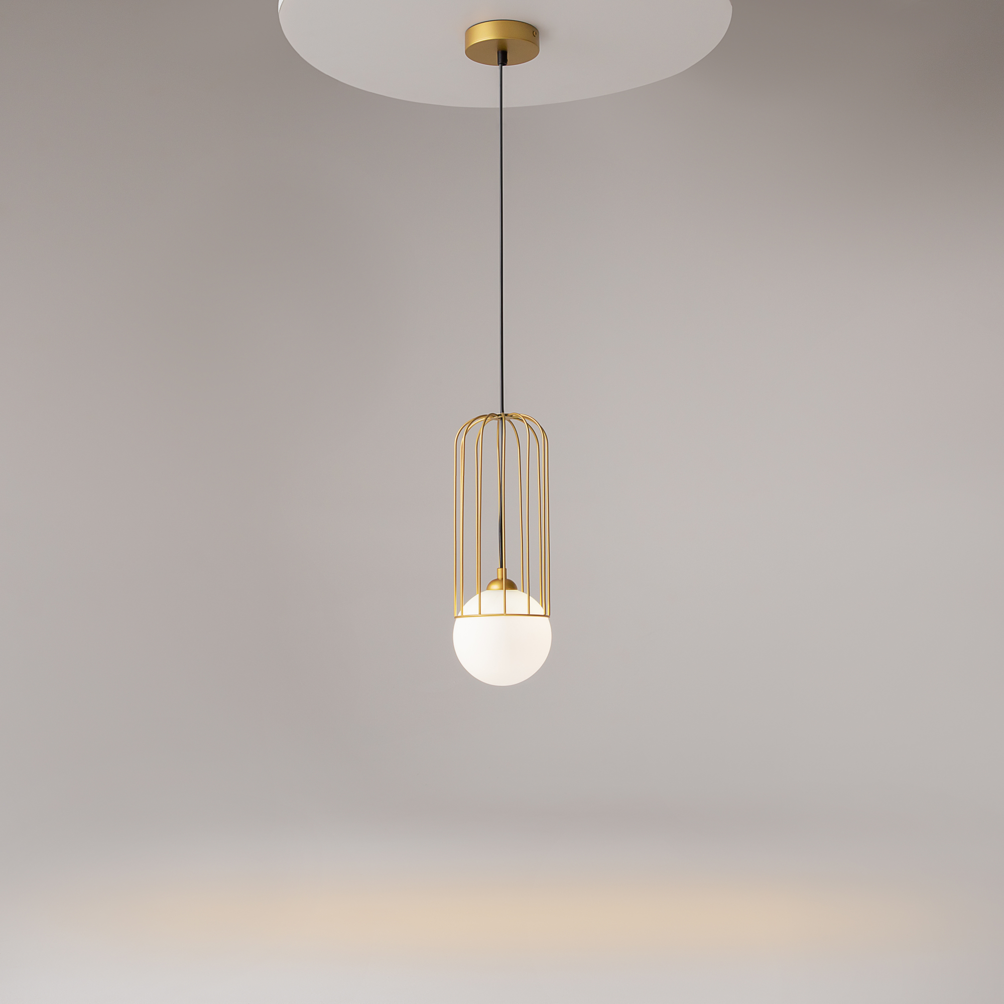 Арматура из металла в золотом цвете. Плафон из матового белого стекла. Декор плафона Telford — решетка из стальной проволоки в тон арматуре. Регулируемая высота.