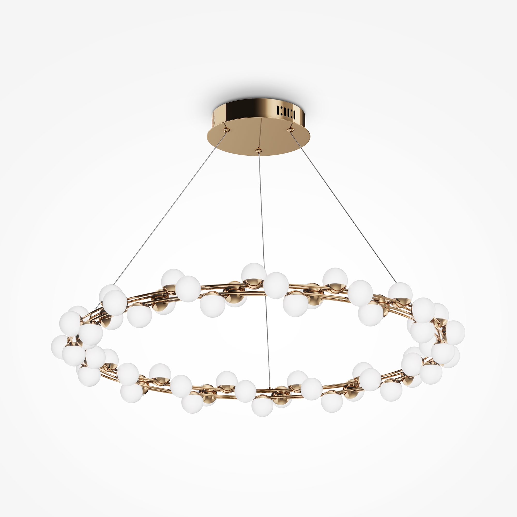 Арматура из металла в золотом цвете. Плафоны-сферы — белый пластик. Дизайн с имитацией молекулярной структуры. LED-источники света.