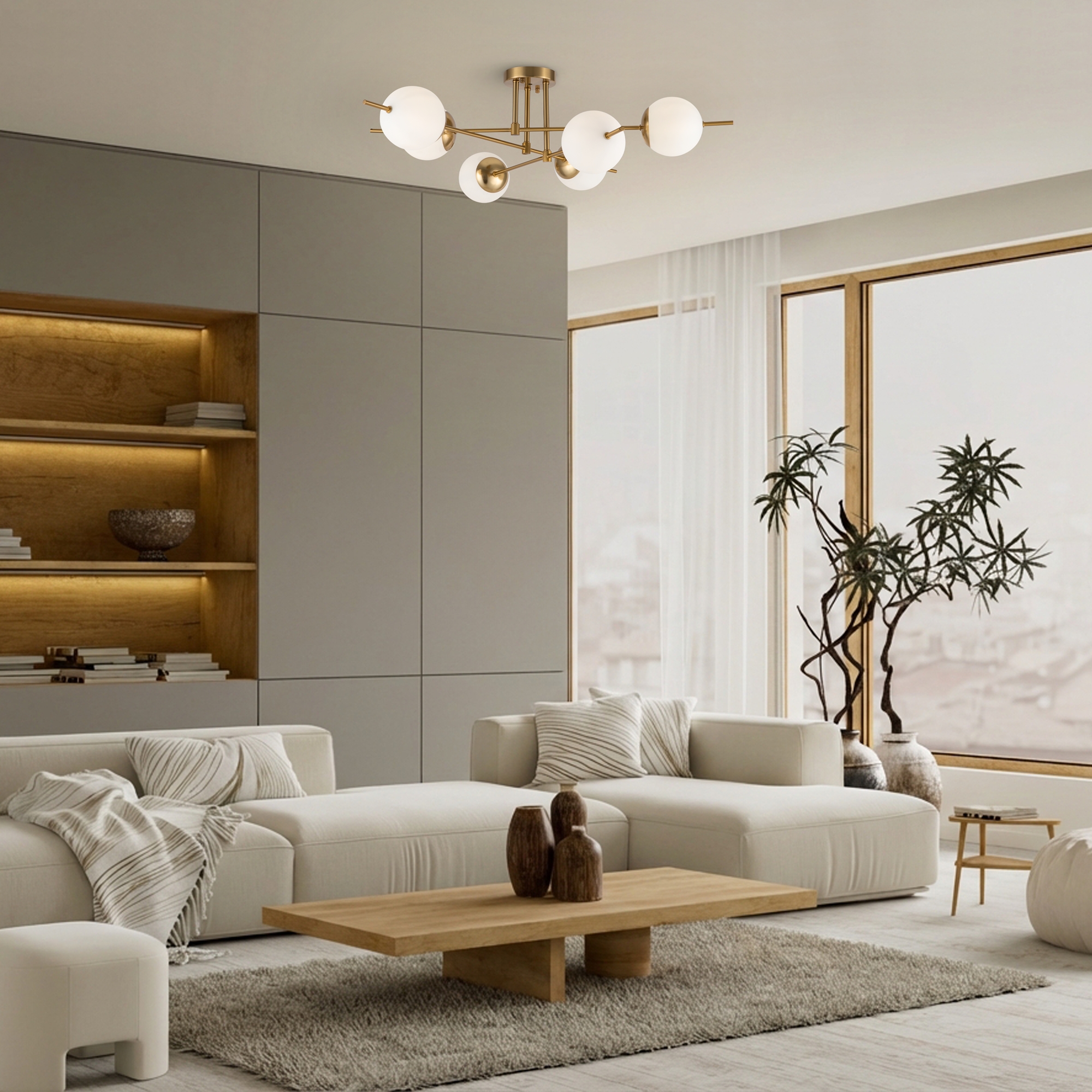 Арматура из металла. Цвет – латунь. Плафоны – матовое белое стекло. Трендовая геометрия в дизайне: арматура «пронизывает» плафоны-сферы. Источник света – лампа с цоколем Е27.