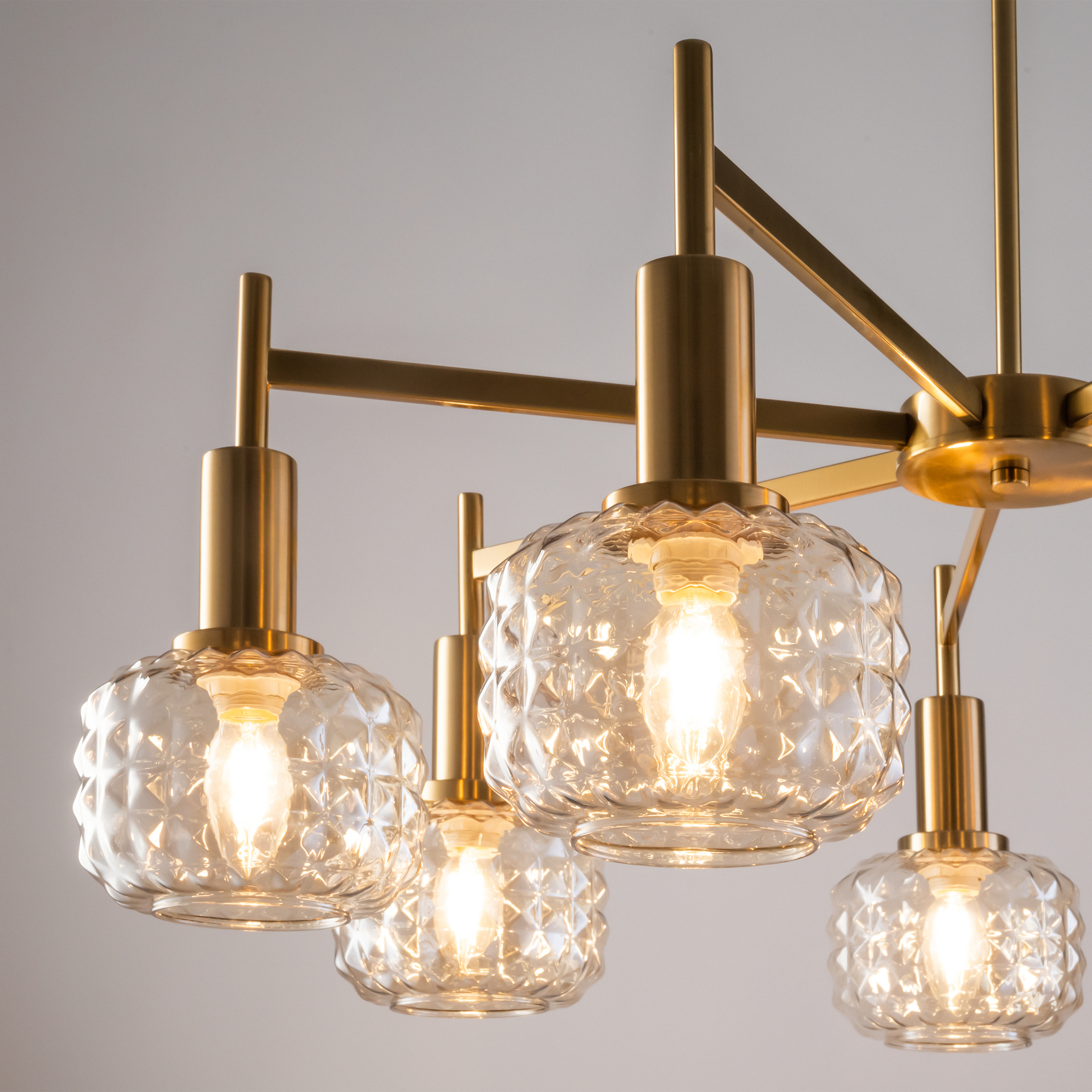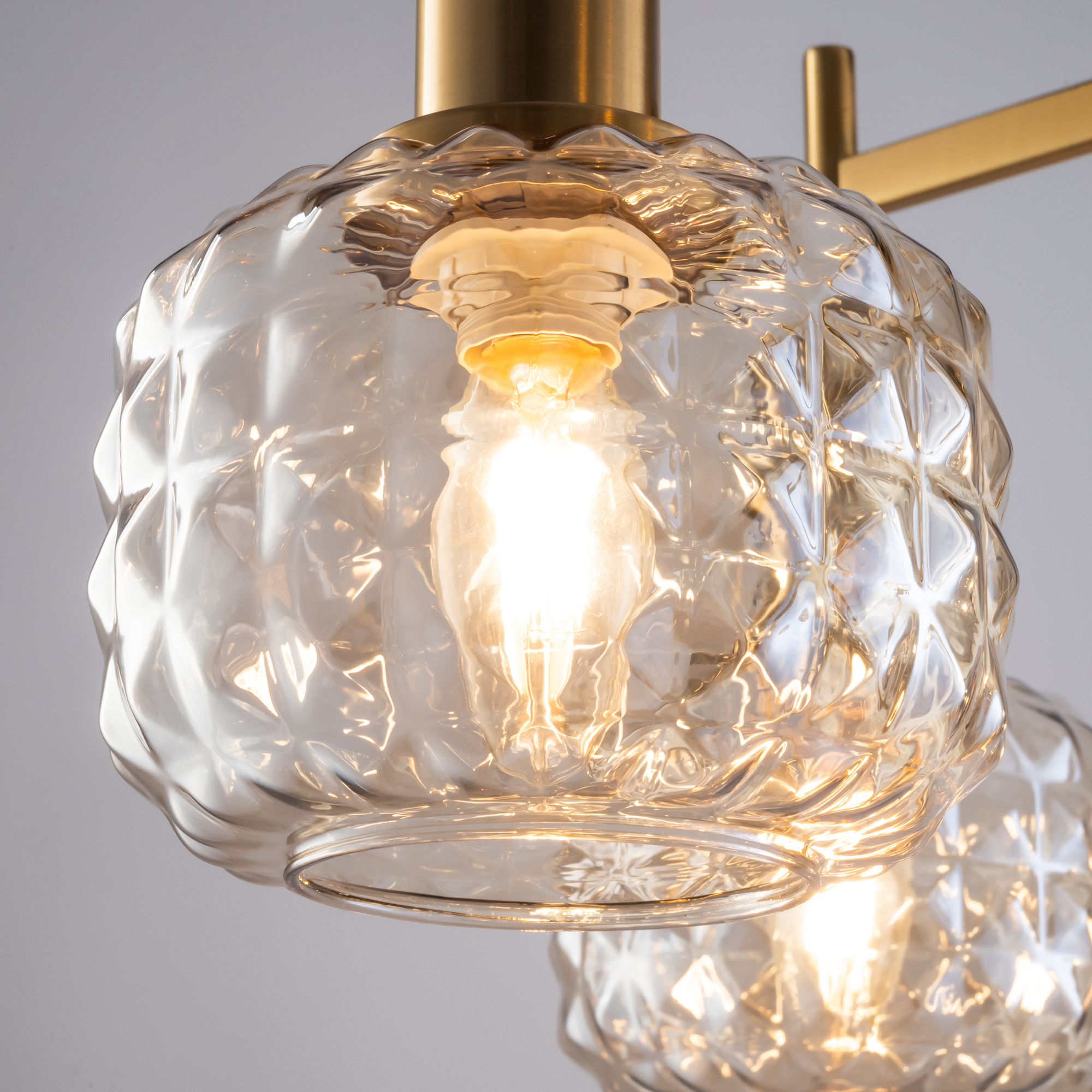 Металлическая арматура в цвете латунь. Плафоны из толстого рельефного стекла в оттенке амбра с «шипованной» огранкой. Подвесные модели регулируется по высоте. Источник света — лампа с цоколем Е14