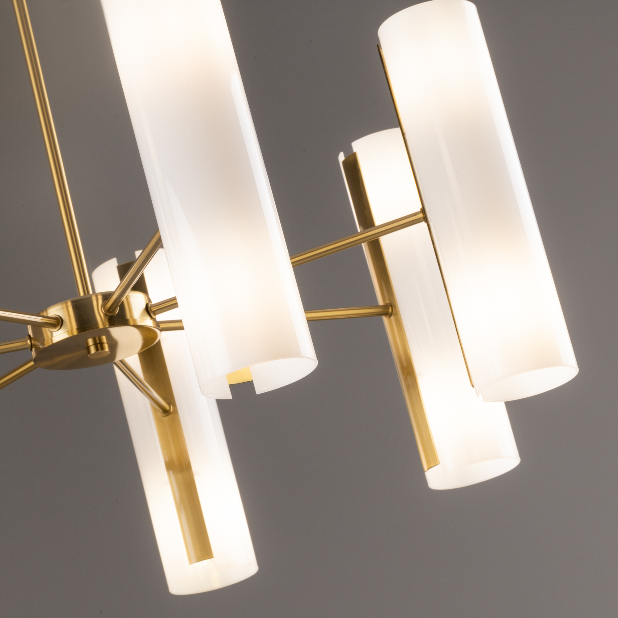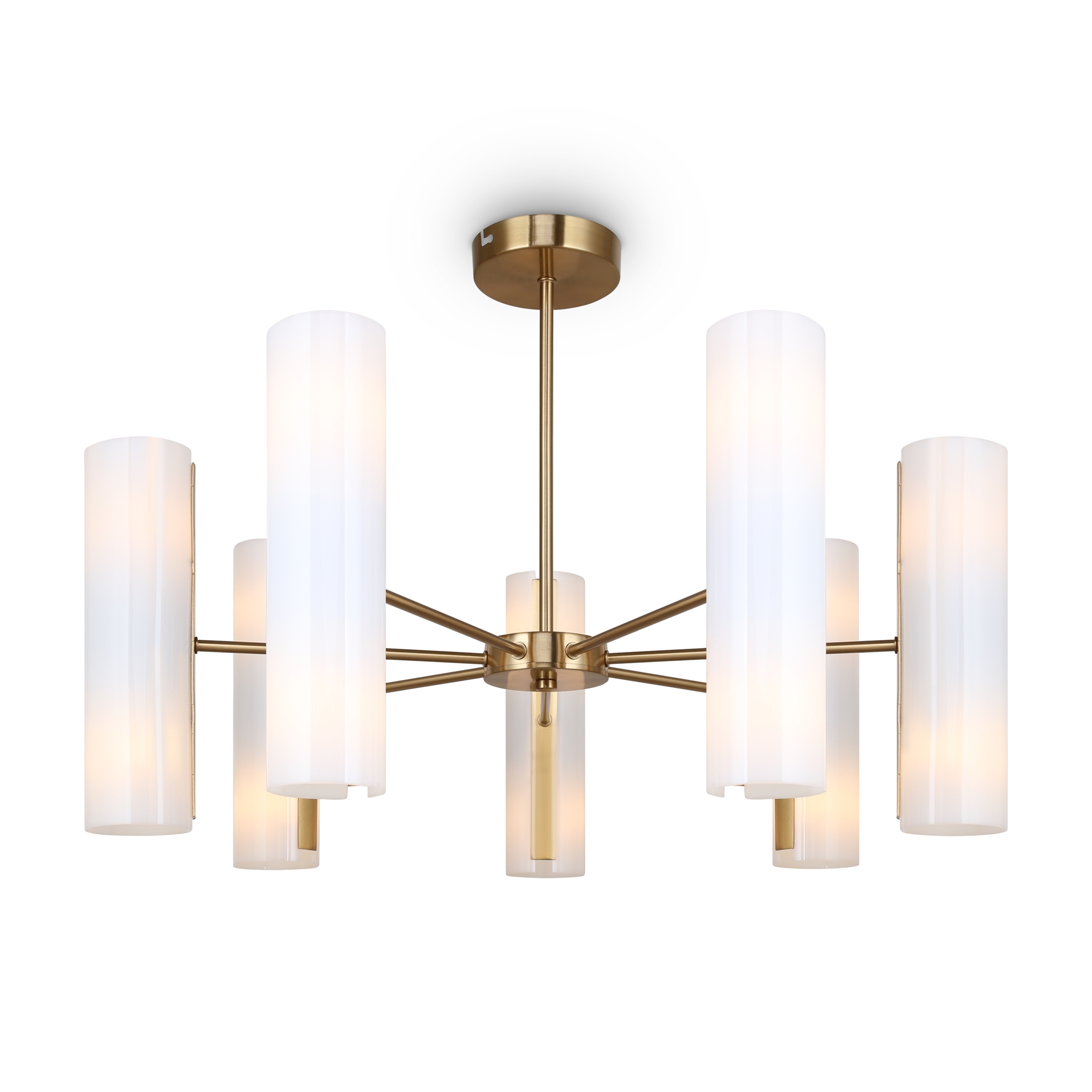 Арматура — металлическая, цвет — латунь. Стеклянные белые плафоны-цилиндры мягко рассеивают свет в стороны. Открытые края плафонов и глянцевая поверхность дают дополнительный свет в вверх и вниз для максимальной освещенности. Источник света — лампа с цоколем Е14.