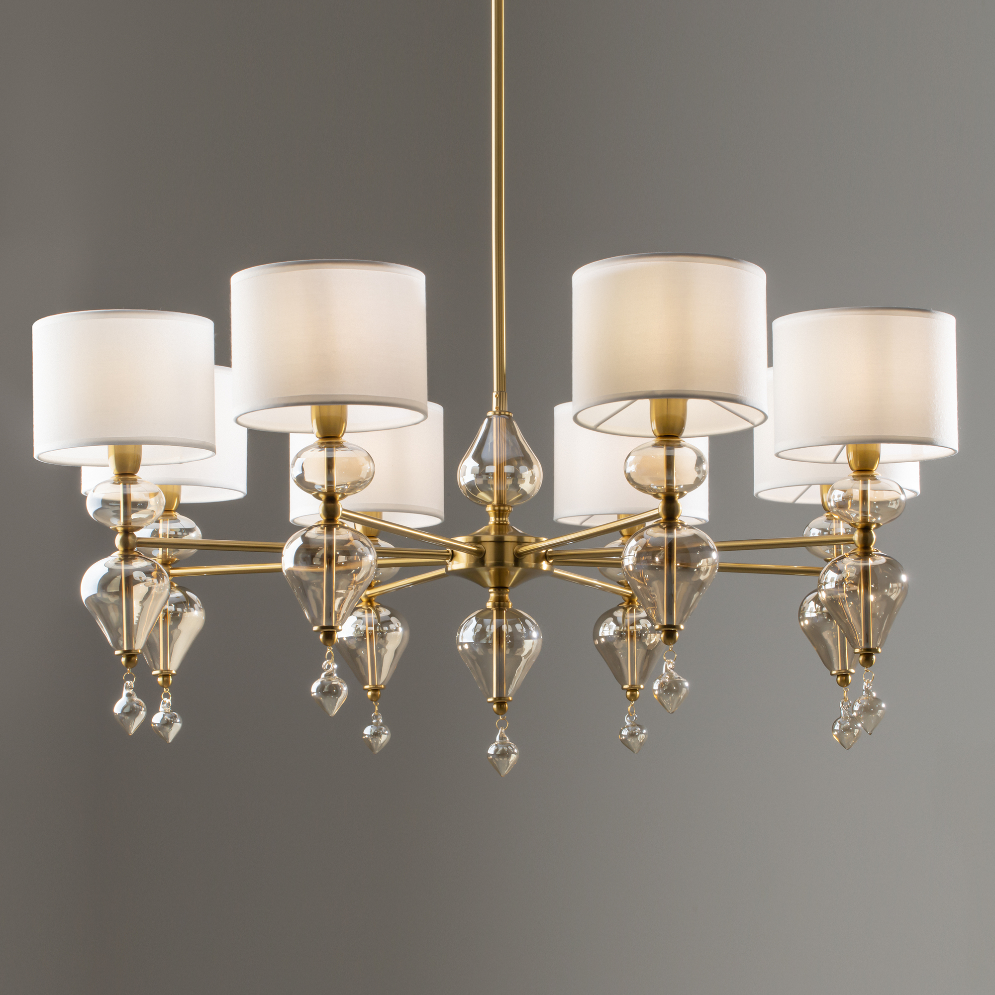 Арматура из металла, цвет — латунь. Плафоны — тканевые, молочного цвета. Металлическая конструкция декорирована выдувными стеклянными элементами с перламутровым напылением. Источником света служит лампа с цоколем Е14.