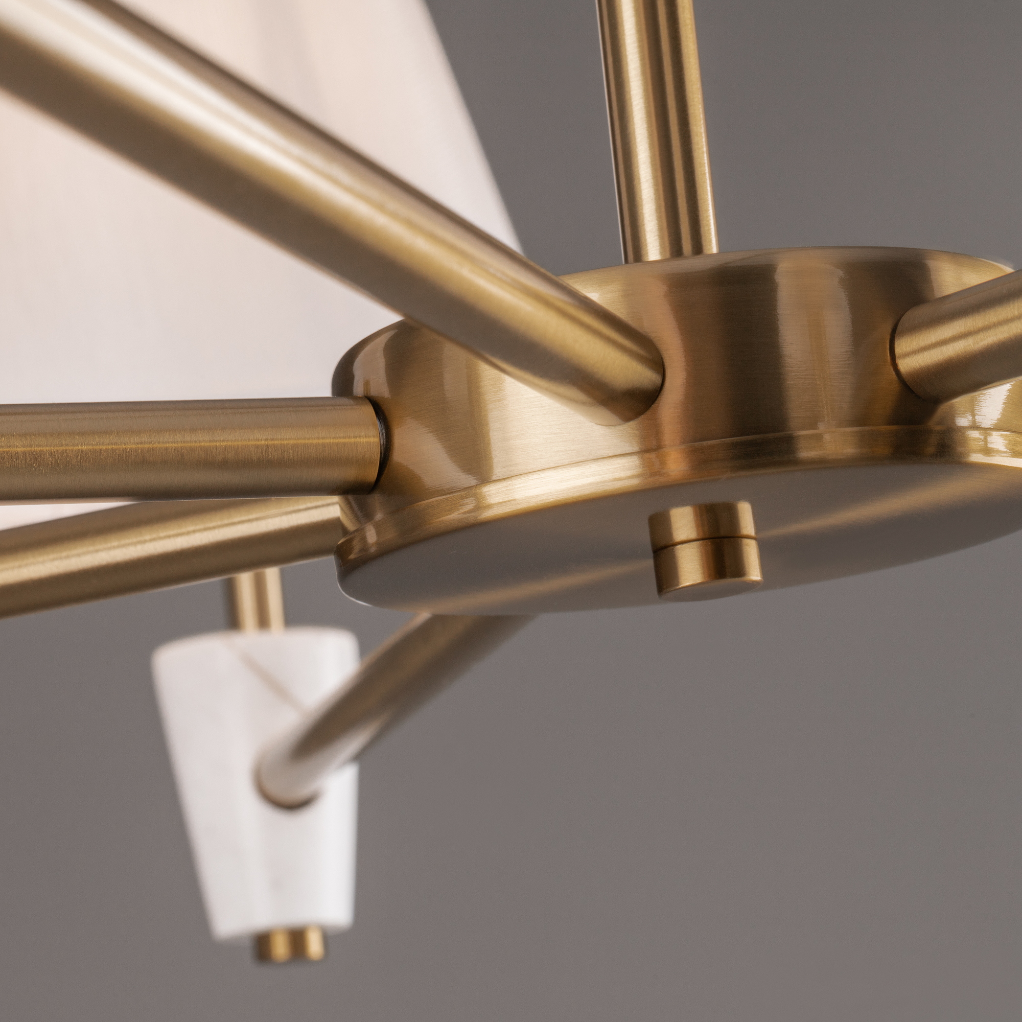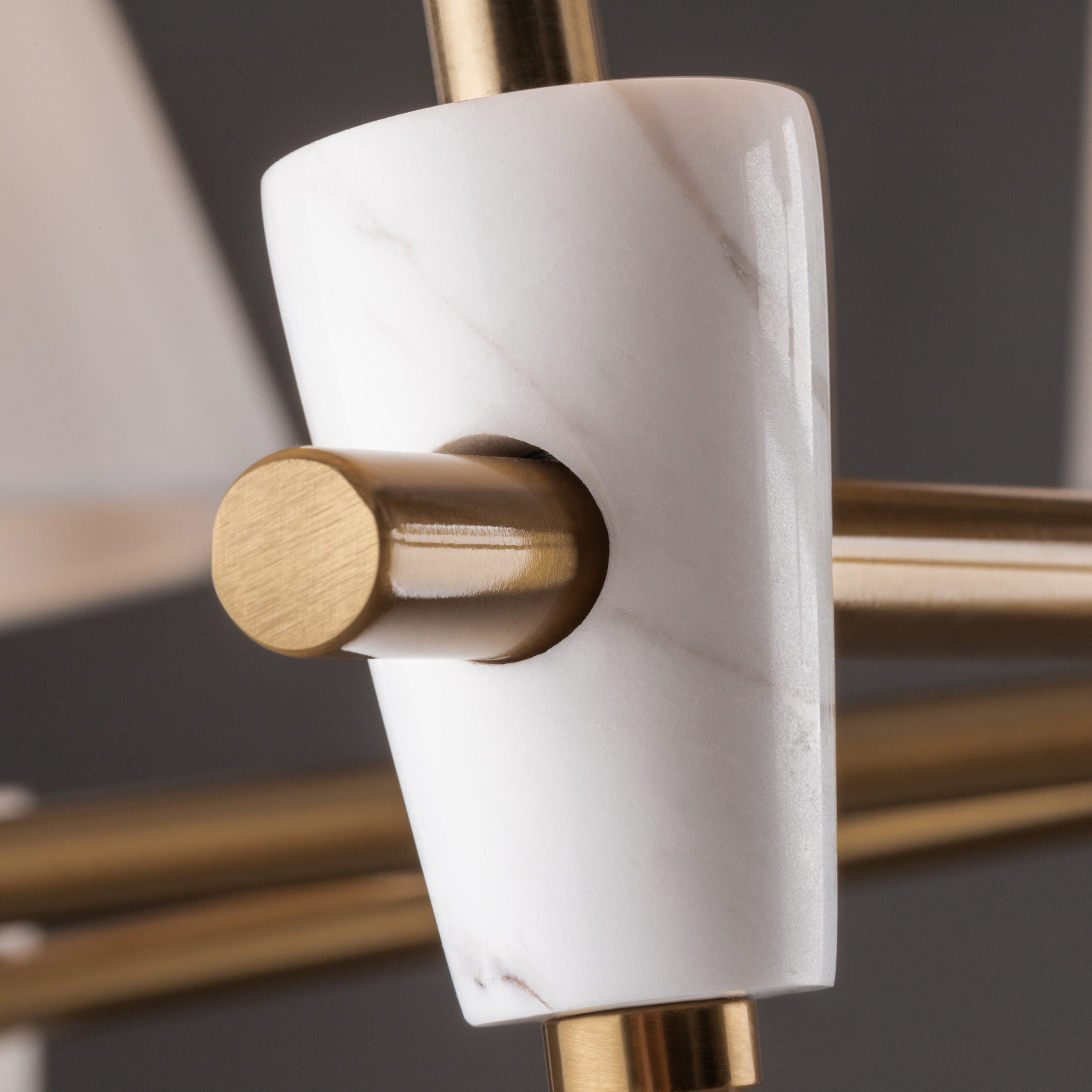 Металлическая арматура в цвете латунь. Дополнительные элементы — минималистичные вставки из натурального белого мрамора. Белые абажуры из ткани в форме конуса. Источник света — лампа с цоколем Е14 или Е27.