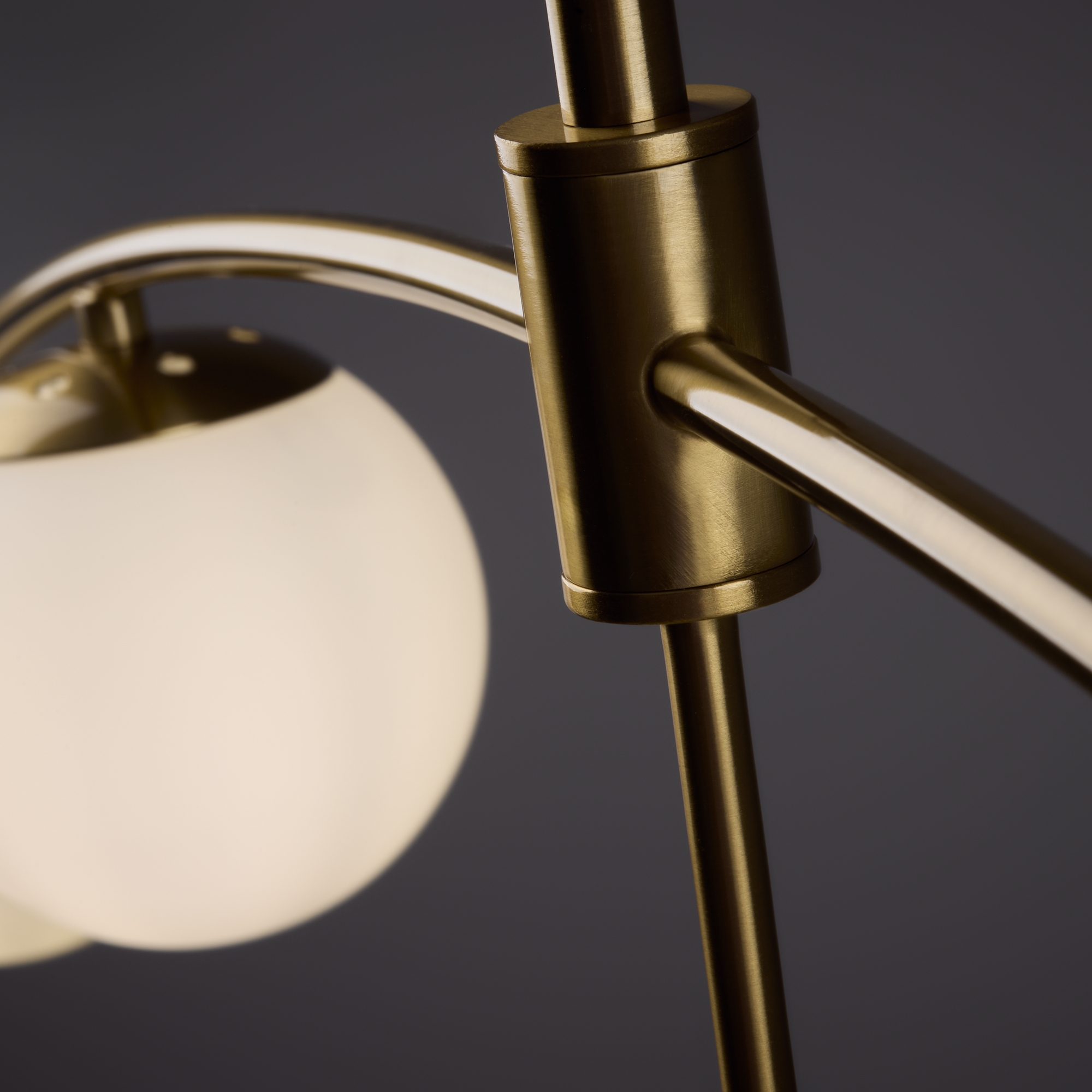 Арматура металл. Цвет латунь. Серия с необычной формой арматуры и раскидистыми плафонами. Белые плафоны в форме шара. Источник света лампа. Цоколь E14.