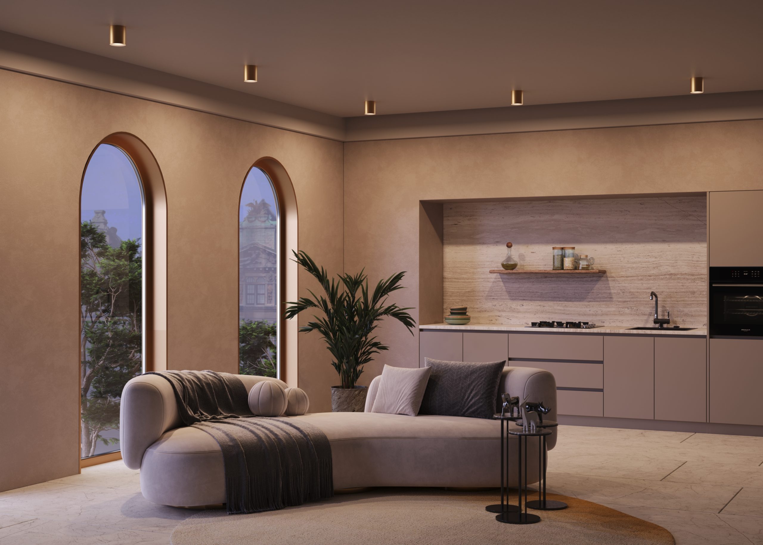 Материал корпуса – металл; цвет – белый, чёрный и золотой. Форма корпуса – стаканчик. Акриловый рассеиватель. Сияющий эффект при свечении. Отсутствие стопорного кольца. Утопленный источник света – лампа GU10.