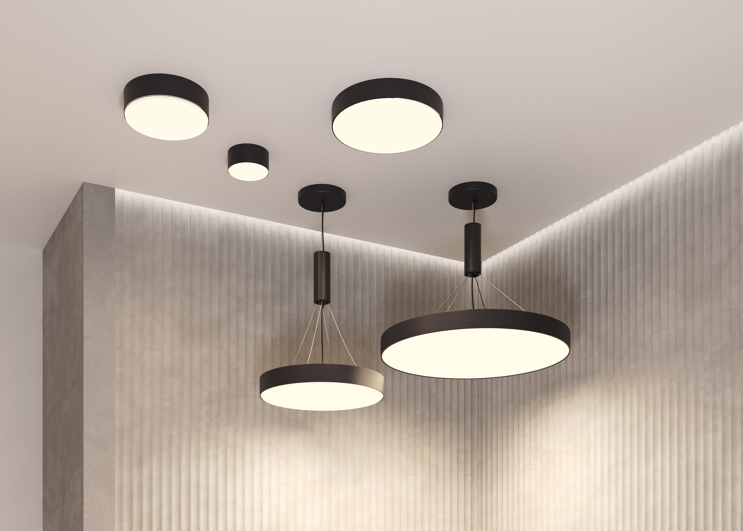 Материал корпуса – металл; цвета – чёрный, белый и золотой. Формы корпуса: круглая и квадратная. Типы монтажа: накладной, подвесной, а также трековые светильники. Подвесной монтаж универсален для обеих форм. Монтаж без видимых болтов. Варианты мощностей: 12W, 24W, 36W, 45W и 90W. LED-источник света. Цветовая температура – 3000 или 4000К. Высокий коэффициент цветопередачи. Совместимость с драйверами DALI и Triac для изменения цветовой температуры и диммирования. Аксессуар для монтажа круглых моделей в ГКЛ под шпаклёвку и универсальное крепление в ассортименте.
