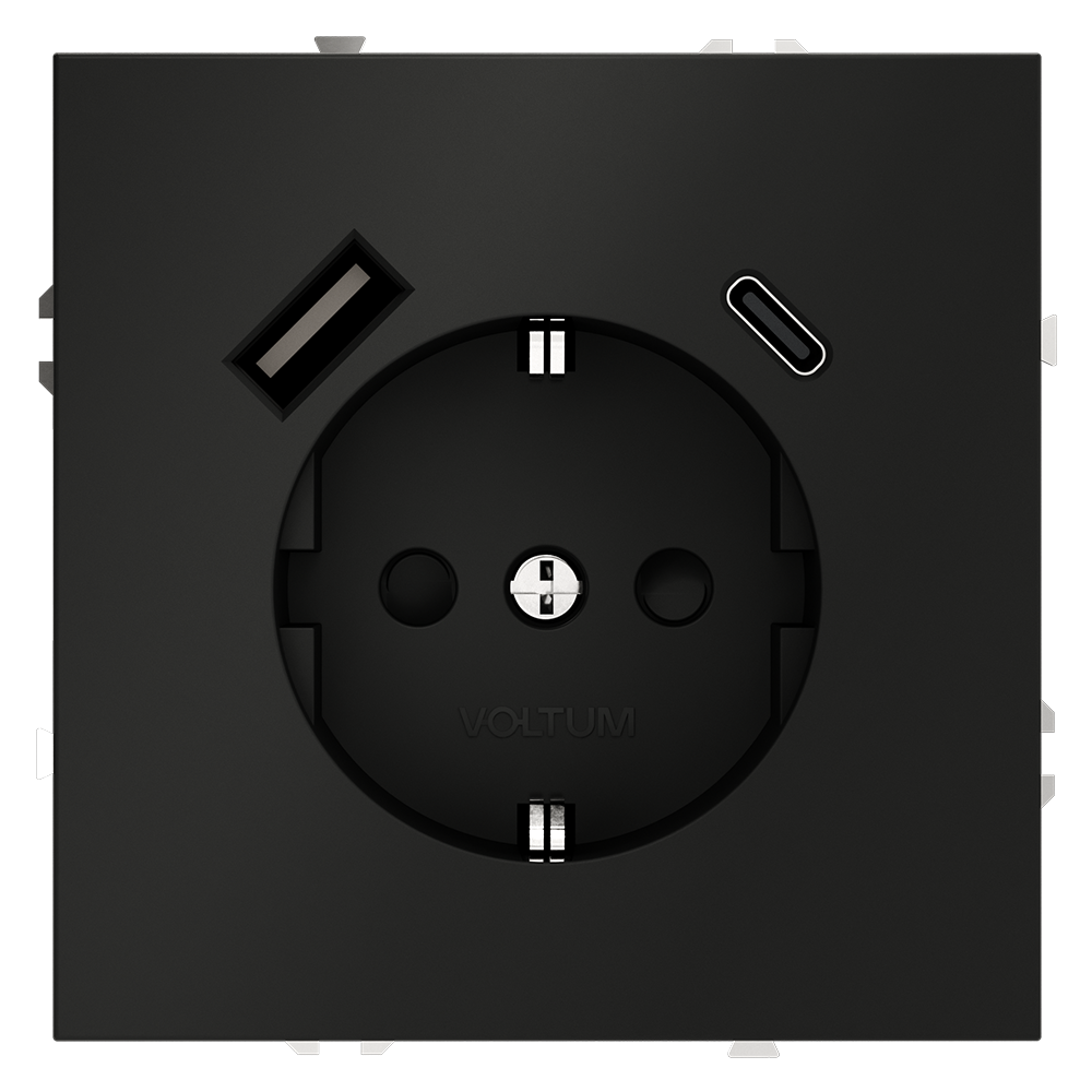 Розетка встраиваемая VOLTUM S70 с заземлением и защитными шторками, 16А, с USB, A+С, (черный матовый