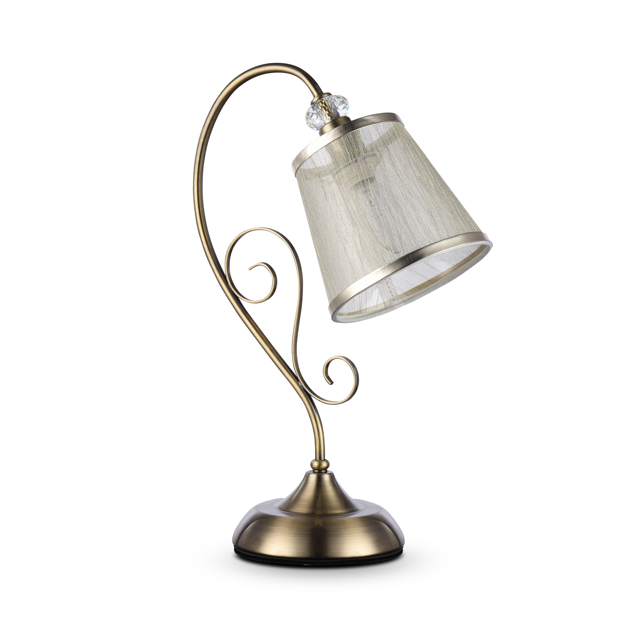 Серия из металла цвета античной бронзы. Арматура светильников Driana дополнена завитками на рожках и узогнутым декором в центральной части. Абажуры из полупрозрачной органзы выполнены в виде колокольчиков и обрамлены ободками из металла. Настольный светильник Freya FR2405-TL-01-BZ