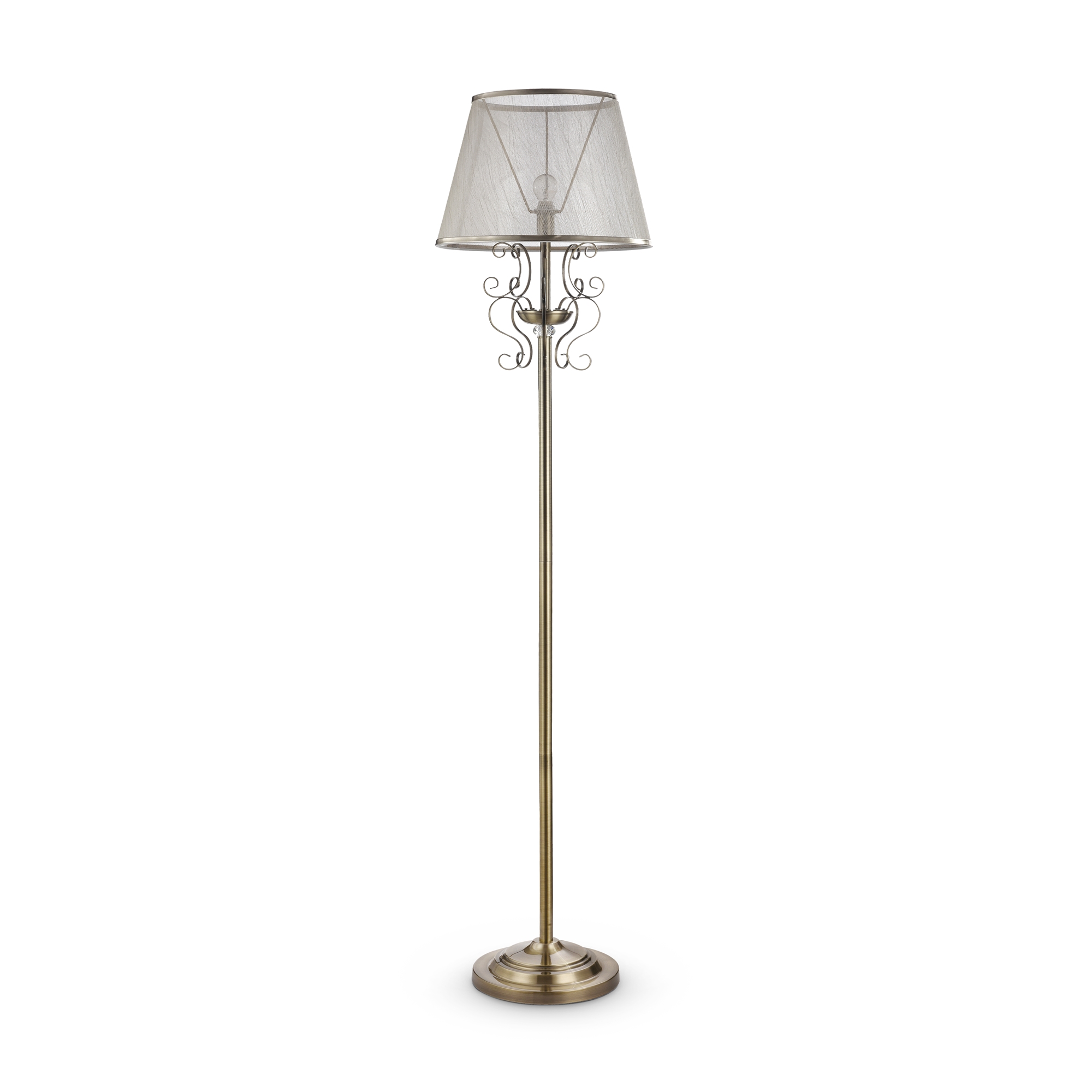 Серия из металла цвета античной бронзы. Арматура светильников Driana дополнена завитками на рожках и узогнутым декором в центральной части. Абажуры из полупрозрачной органзы выполнены в виде колокольчиков и обрамлены ободками из металла. Напольный светильник (торшер) Freya FR2405-FL-01-BZ